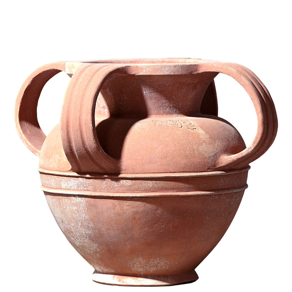 Die Form dieser Amphore orientiert sich an den historischen Vorbildern: ein großer, bauchiger Körper mit zwei elegant geschwungenen Henkeln und einem schmalen Hals, der in eine feine, leicht ausgestellte Mündung übergeht. Dieses klassische Design verleiht der Amphore eine harmonische, ausgewogene Silhouette und macht sie zu einem eindrucksvollen Schmuckstück für Garten, Terrasse oder Innenraum.