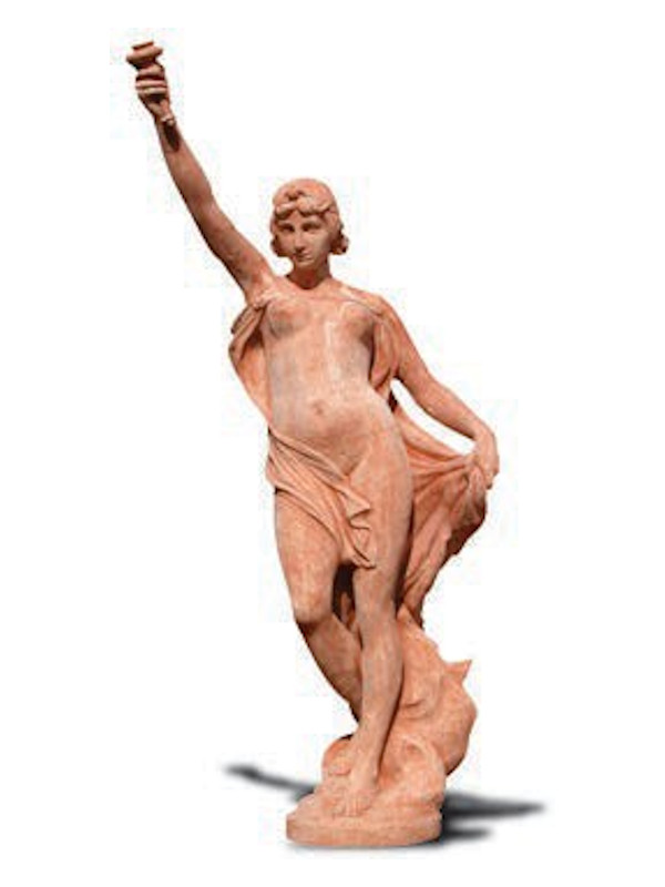 Die Statue der Fackelträgerin aus Impruneta Terracotta ist ein beeindruckendes Kunstwerk, das die Eleganz und Raffinesse der antiken Kunst mit der handwerklichen Meisterschaft der Toskana vereint. Diese Gartendekoration zeigt eine anmutige Frauenfigur, die eine brennende Fackel in ihren erhobenen Händen hält. Die Szene ist von einer zeitlosen Schönheit geprägt und vermittelt eine Atmosphäre von Mystik und Erhabenheit. Die Details der Statue sind präzise und kunstvoll gestaltet. Die feinen Gesichtszüge der Fackelträgerin strahlen Ruhe und Entschlossenheit aus. Ihr Gewand fällt in fließenden Falten herab und betont ihre grazile Silhouette. Die Fackel, die sie in ihren Händen hält, ist mit beeindruckender Realismus dargestellt, von den züngelnden Flammen bis zu den kunstvoll gearbeiteten Halterungen. Die Impruneta Terracotta, aus der diese Statue handgefertigt ist, verleiht dem Kunstwerk eine warme und erdige Farbe, die perfekt zur natürlichen Umgebung eines Gartens passt. Diese Terracotta ist nicht nur ästhetisch ansprechend, sondern auch wetterfest, was bedeutet, dass die Statue den verschiedenen Witterungsbedingungen standhalten kann, ohne ihre Schönheit einzubüßen. Die Fackelträgerin aus Impruneta Terracotta ist nicht nur eine Dekoration für den Garten, sondern auch ein Symbol für Licht, Erleuchtung und Wissen. Sie strahlt eine ruhige Kraft aus und fügt jedem Garten eine Atmosphäre von Eleganz und Spiritualität hinzu. Durch die Handfertigung in der Toskana erhält die Statue eine besondere Authentizität und wird zu einem wahren Schatz für Kunstliebhaber und Gartenenthusiasten gleichermaßen.