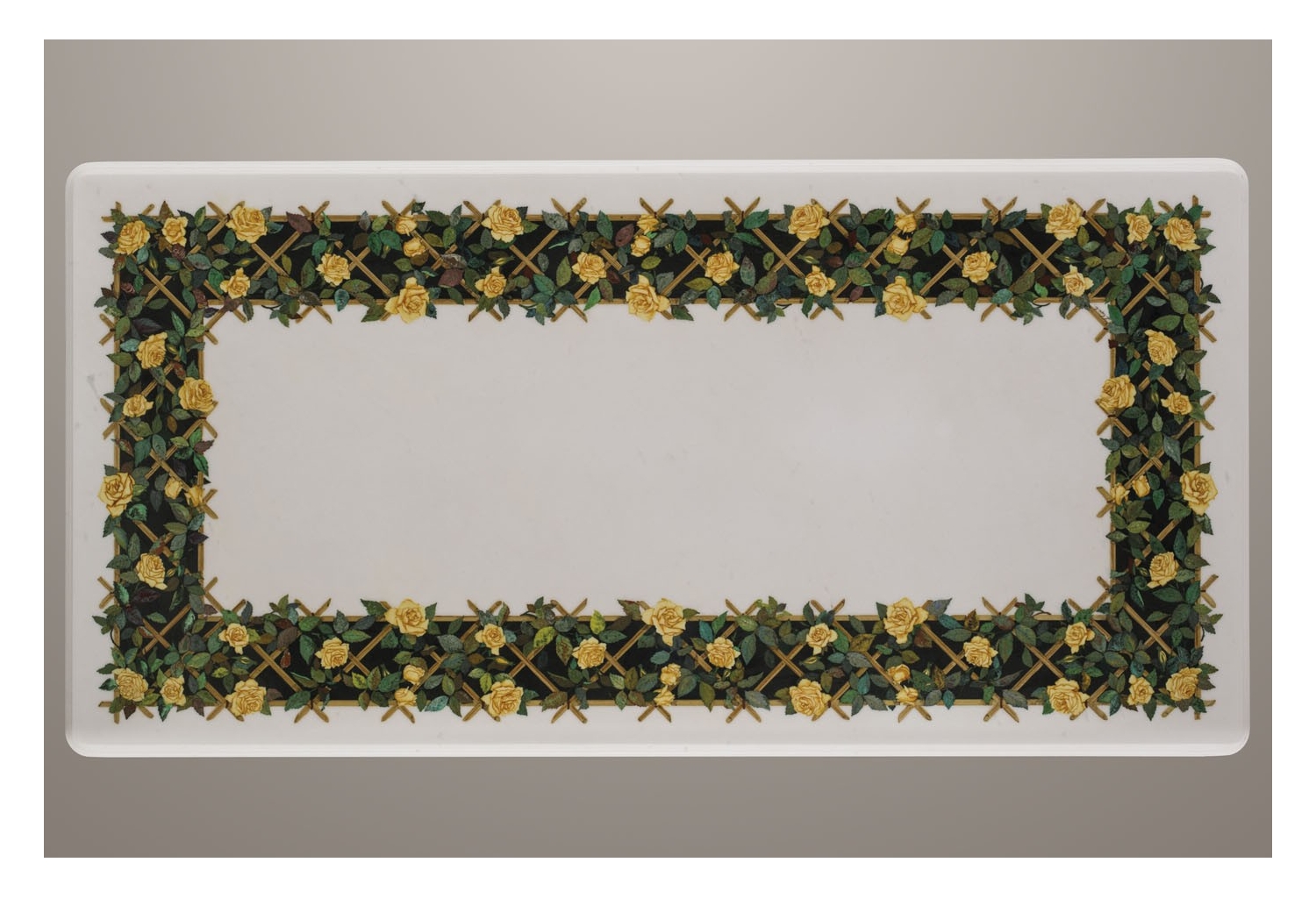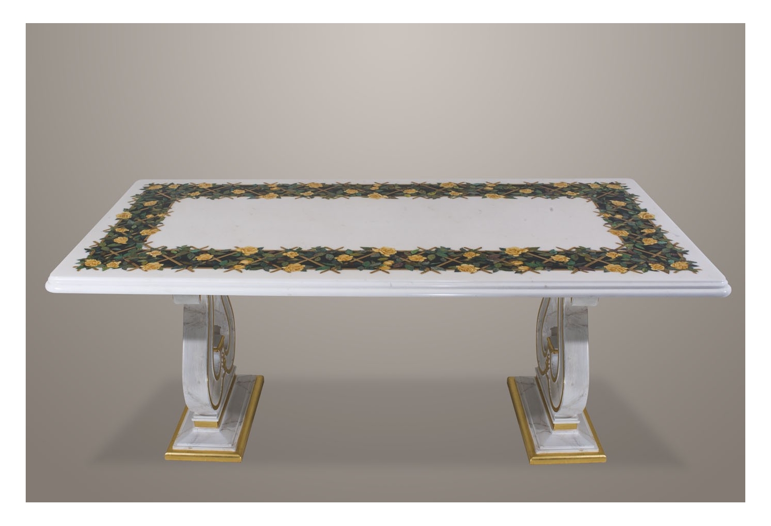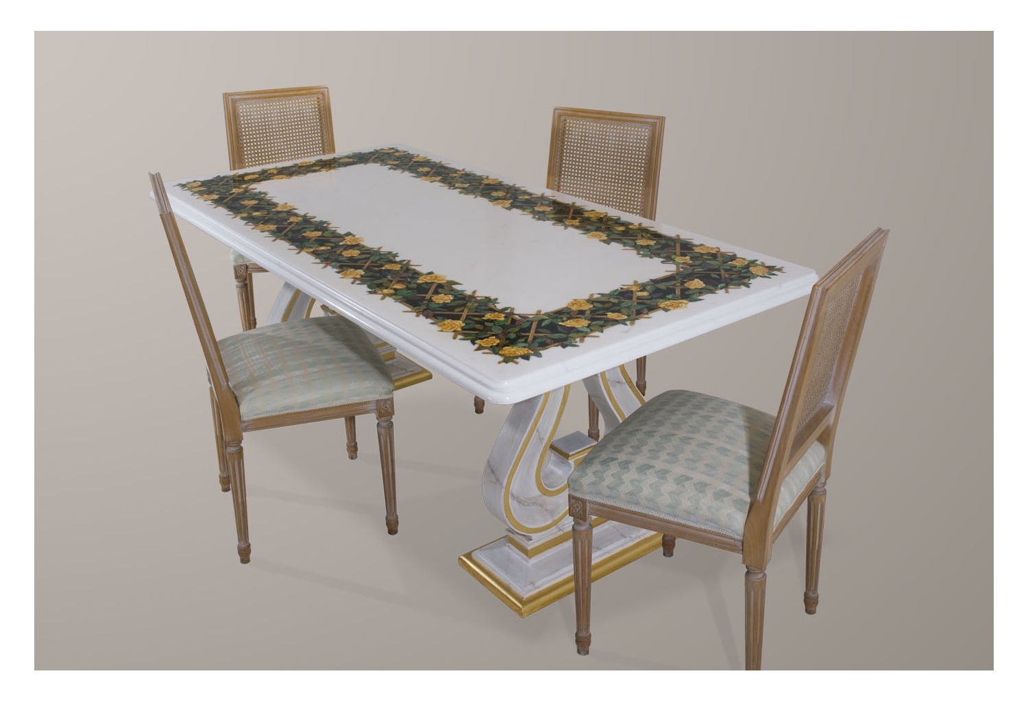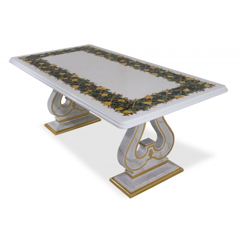 Asfoldelo ist ein reinweißer Esstisch mit strahlend weißer Marmorplatte und gelben Rosen. Eingearbeitet ist ein exklusives Muster, in dem Rosen durch ein Geflecht aus Blättern und Zweigen hervortreten. Der Tischfuß besteht aus Holz, verziert mit Blattgold. Seine Form ist angelehnt an das Instrument Lyra. Scagliola ist die antike Kunst, architektonische Elemente aus Stuck herzustellen, die wie Marmor aussehen. Diese Technik erlangte im 18. Jahrhundert in Florenz und Venedig einen hohen Bekanntheitsgrad. Hergestellt wird eine dekorierte Marmorplatte, die mit farblich strahlenden Intarsien gefüllt wird. Somit entsteht eine schimmernde von innen heraus scheinende Wirkung, die langfristig strahlend bleibt.