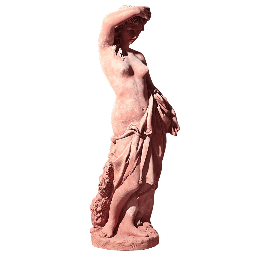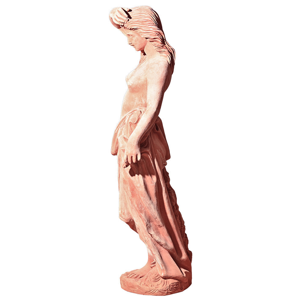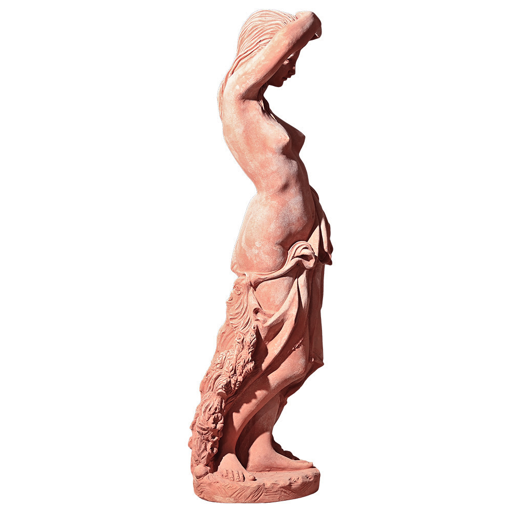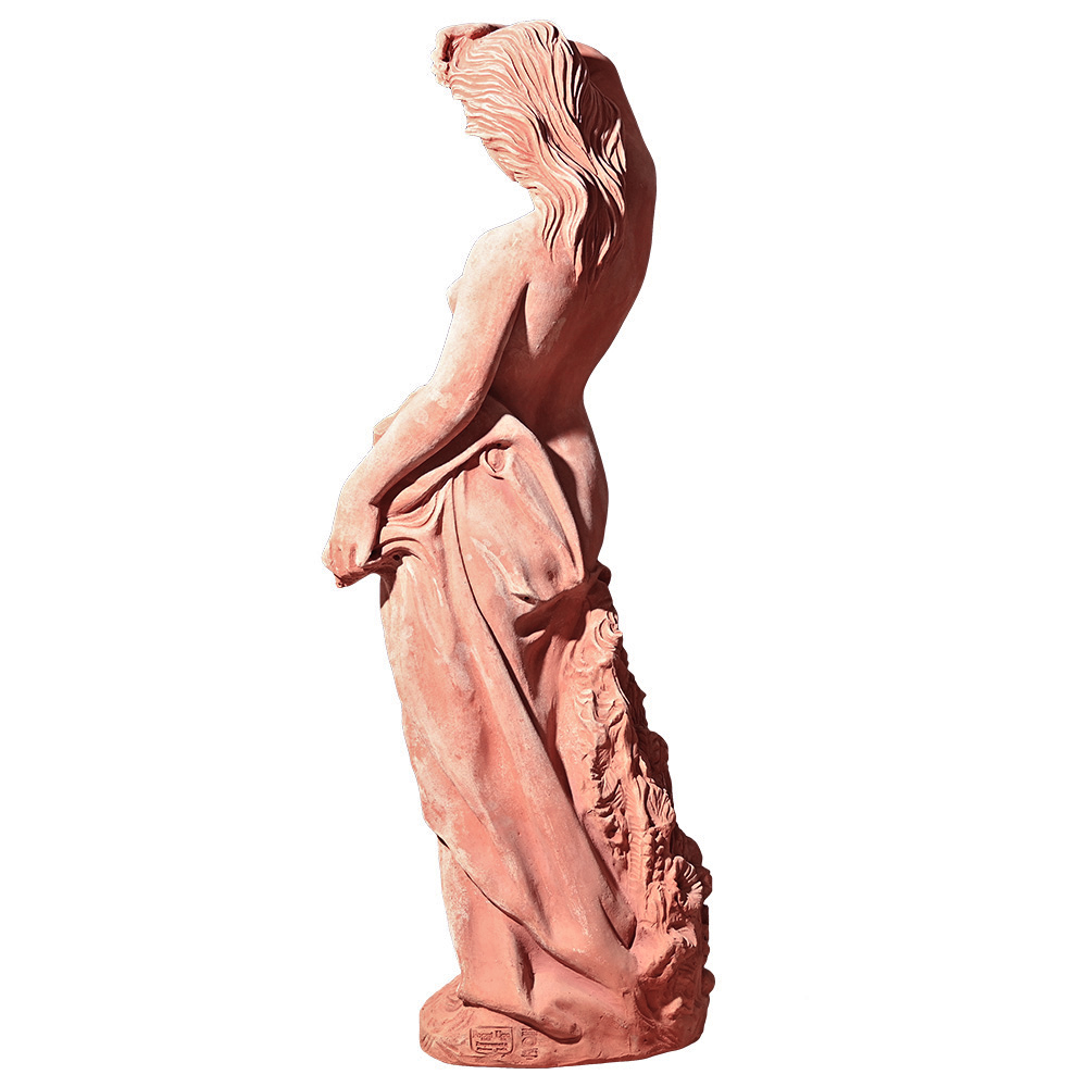 Die Terrakotta-Statue "Aurora" aus Impruneta präsentiert sich in einer faszinierenden Haltung des Kontraposts. Die Göttin der Morgenröte ist in einem anmutigen Drehmoment dargestellt, ihr Körper elegant gedreht, um eine dynamische Bewegung zu vermitteln. Auf einem zierlichen Sockel ruhend, unterstreicht die Statue ihre Erhabenheit und Anmut.