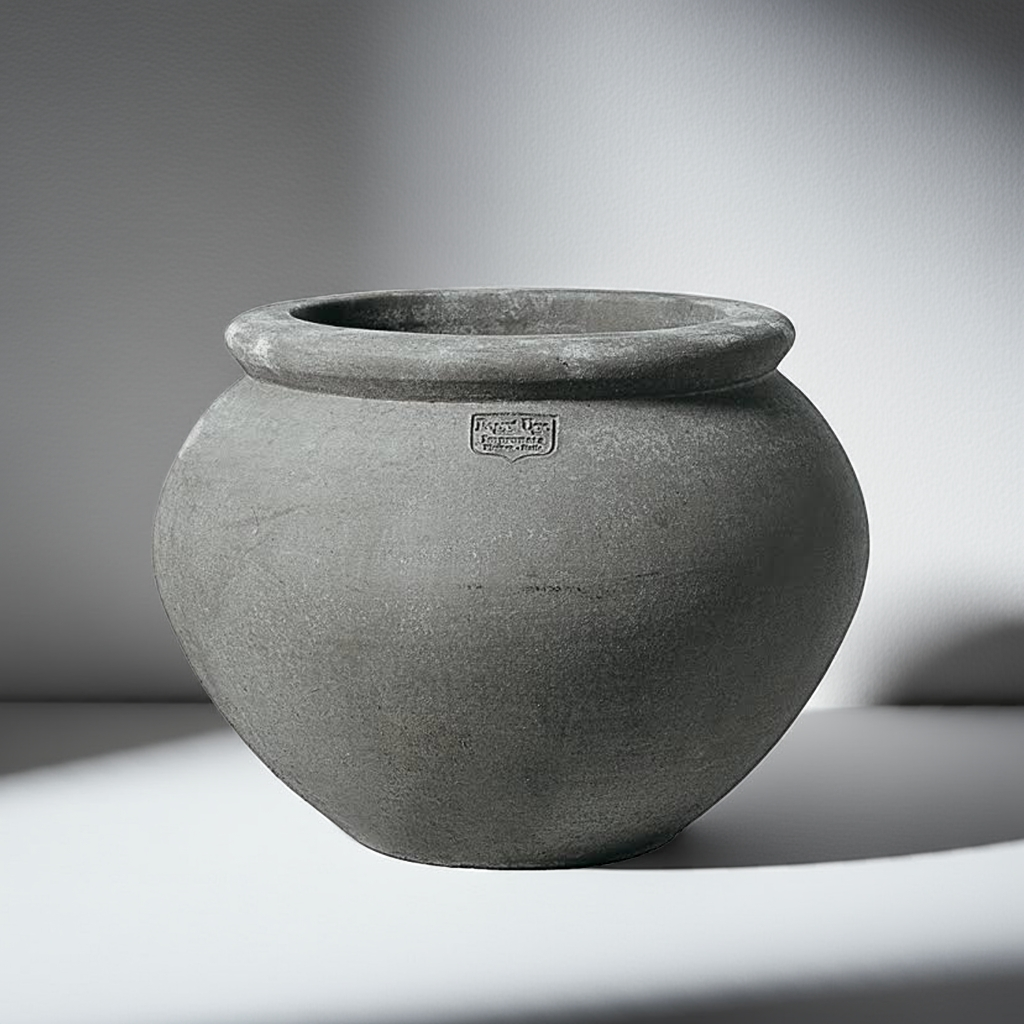 Massiver, schlichter, bauchiger Terracottatopf aus Impruneta. Dieser Blumentopf ist in einer Größe erhältlich. Pflanztopf mit Außenmaßen an der breitesten Stelle Durchmesser 50 cm, Durchmesser Öffnung innen 32cm, Höhe 40 cm Frostfest bis -30°C