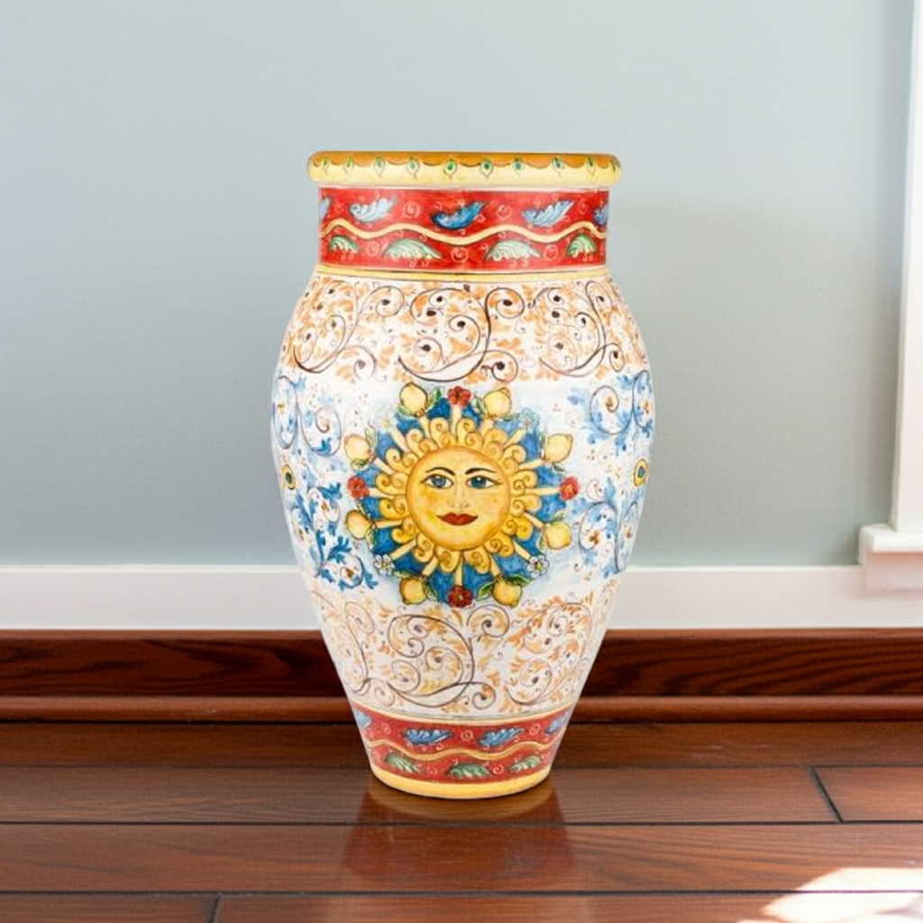Die bemalte Bodenvase aus Sizilien ist ein strahlendes Kunstwerk, das die reiche Kultur und die lebendige Natur dieser Region widerspiegelt. Die Grundfarbe der Vase ist ein warmes und lebendiges Gelb, das die Atmosphäre der Sonne einfängt und dem Raum eine einladende Helligkeit verleiht. Auf der Oberfläche der Vase erstreckt sich eine kunstvolle Darstellung einer Sonne. Die Sonne ist mit lebhaften Farben gemalt, die von leuchtendem Gelb bis zu warmen Orangetönen reichen. Diese sonnenähnliche Bemalung strahlt Wärme und Positivität aus, und ihre Strahlen sind mit feinen Details versehen, die die Handwerkskunst und Aufmerksamkeit zum Detail betonen. Umgeben ist die Sonne von bunten floralen Ornamenten, die die Vielfalt der sizilianischen Flora repräsentieren. Blumen in verschiedenen Formen und Farben winden sich um die Vase und schaffen ein lebendiges Muster. Die kräftigen Farbtöne der Blumen, darunter Rottöne, Blau und Grün, kontrastieren wunderbar mit dem sonnigen Gelb der Vase.
