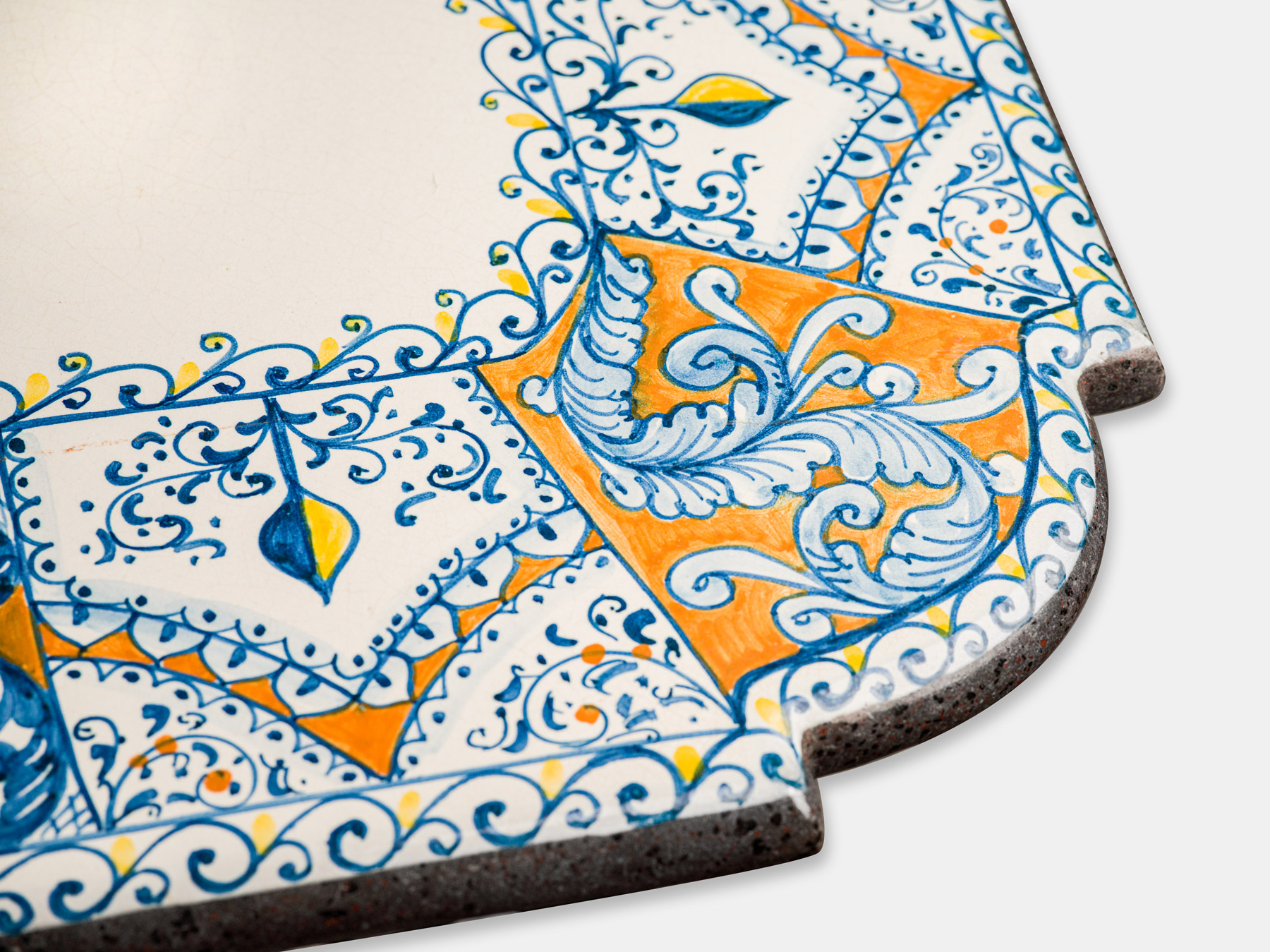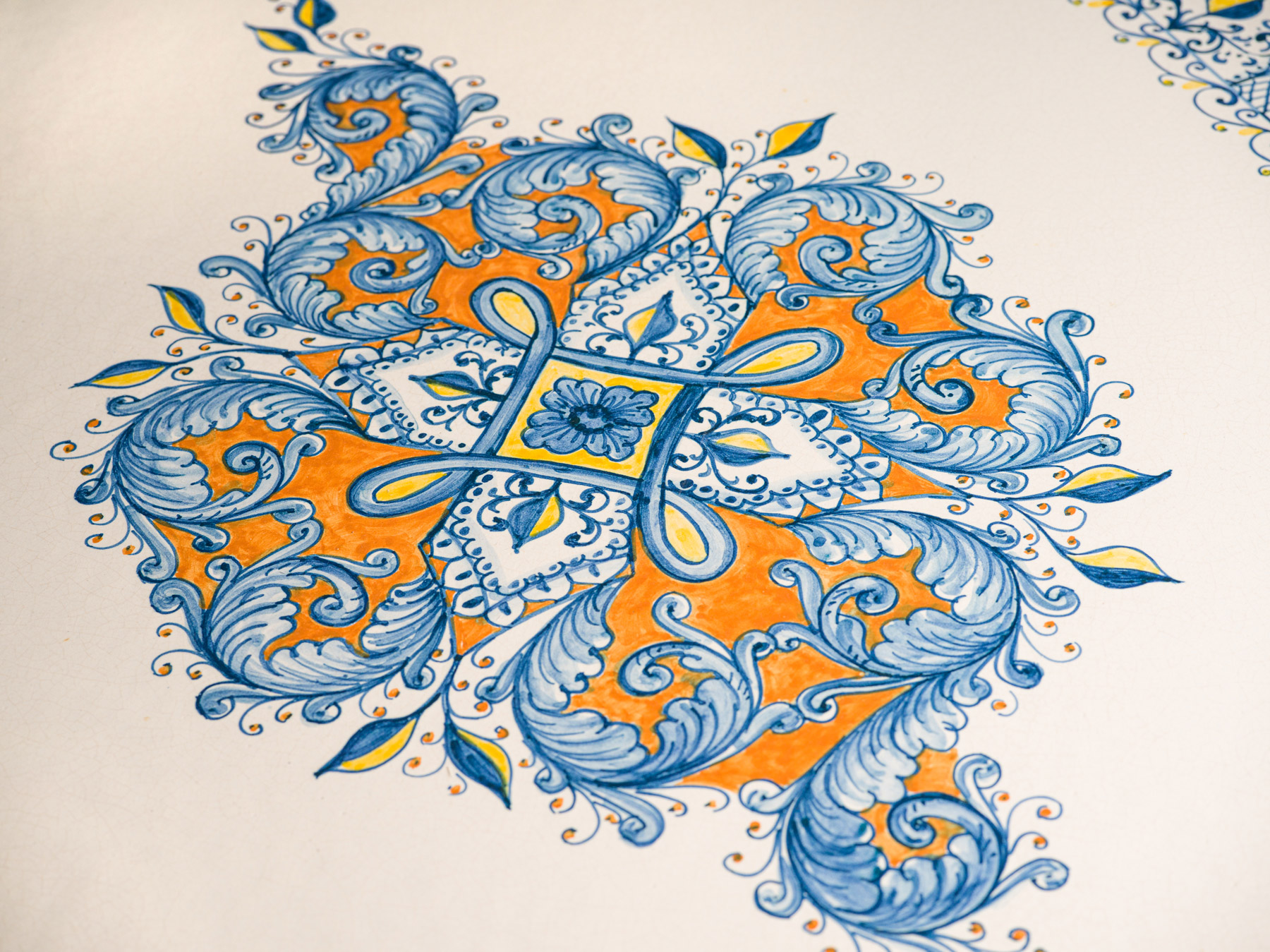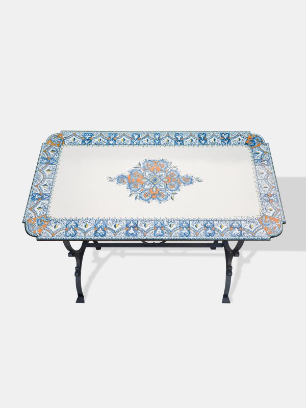 Der Tisch aus Lavastein aus Italien ist ein faszinierendes Stück, das mit einem blendenden Mix aus blauem und orangefarbenem floralem sowie geometrischem Dekor verziert ist. Die künstlerischen Muster scheinen sich harmonisch miteinander zu verflechten, wobei die lebendigen Farben eine lebhafte und auffällige Ästhetik schaffen. Das florale Muster, das , Blüten oder andere Pflanzenelemente darstellt, ergänzt sich perfekt mit den geometrischen Forme. Die Verwendung von Blau und Orange verleiht dem Tisch eine gewisse Dynamik und lässt ihn strahlen. Die Handwerkskunst aus Italien zeigt sich in diesem Tisch, und die Wahl des Lavasteins als Material verleiht ihm nicht nur eine robuste Qualität, sondern vermutlich auch eine gewisse Einzigartigkeit in der Textur. Insgesamt scheint dieser Tisch eine eindrucksvolle Kombination aus Kunst, Handwerkskunst und Stil zu sein, die sicherlich jeden Raum bereichert, in dem er platziert wird.