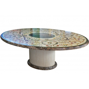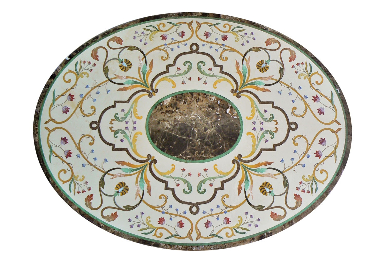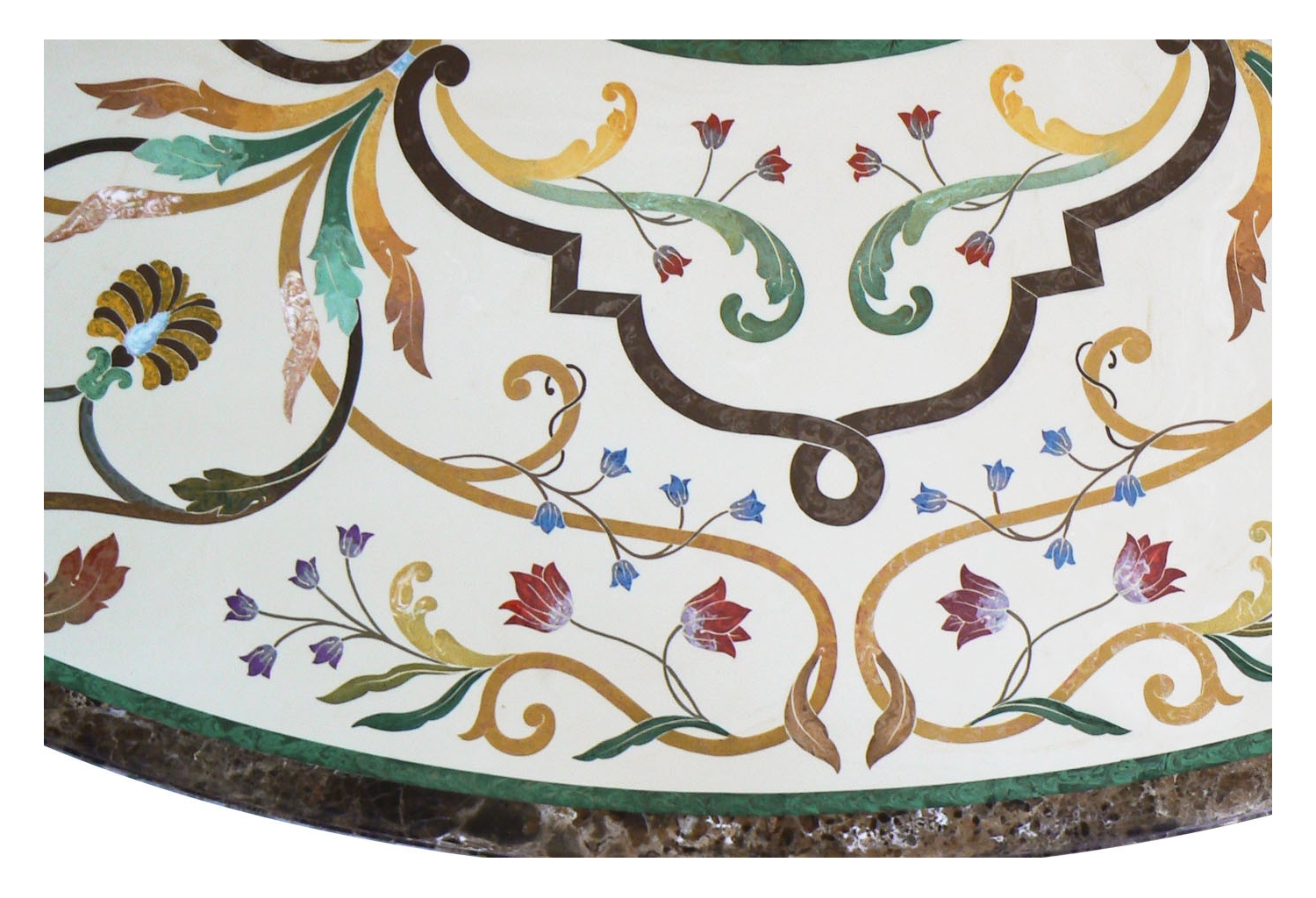 Ovaler Esstisch aus cremefarbenen Marfil Marmor kombiniert mit braunem Emperador Marmor und Scagliola Intarsien. Auch der Tischfuß besteht aus braunem Marmor. Die ovale Form in Kombination mit dem kanellierten Fuß erzeugt eine einmalige Eleganz. Scagliola ist die antike Kunst, architektonische Elemente aus Stuck herzustellen, die wie Marmor aussehen. Diese Technik erlangte im 18. Jahrhundert in Florenz und Venedig einen hohen Bekanntheitsgrad. Hergestellt wird ein Marmorimitat, was mit farblich strahlenden Intarsien gefüllt wird. Somit entsteht eine schimmernde von innen heraus scheinende Wirkung, die langfristig strahlend bleibt.