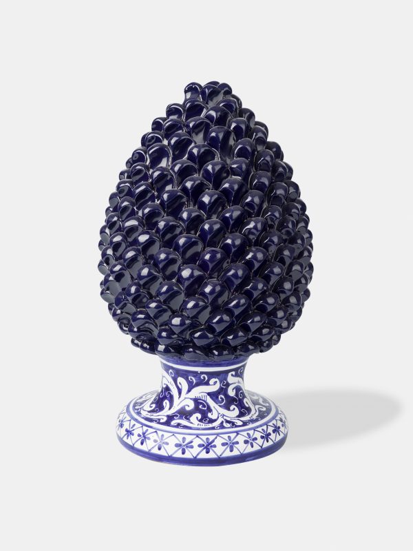 Blauer Pinienzapfen mit verziertem Fuß, handgefertigt aus Sizilien. Handarbeit nach jahrhundertealter Tradition, mit leuchtenden Emaillen bemalt..