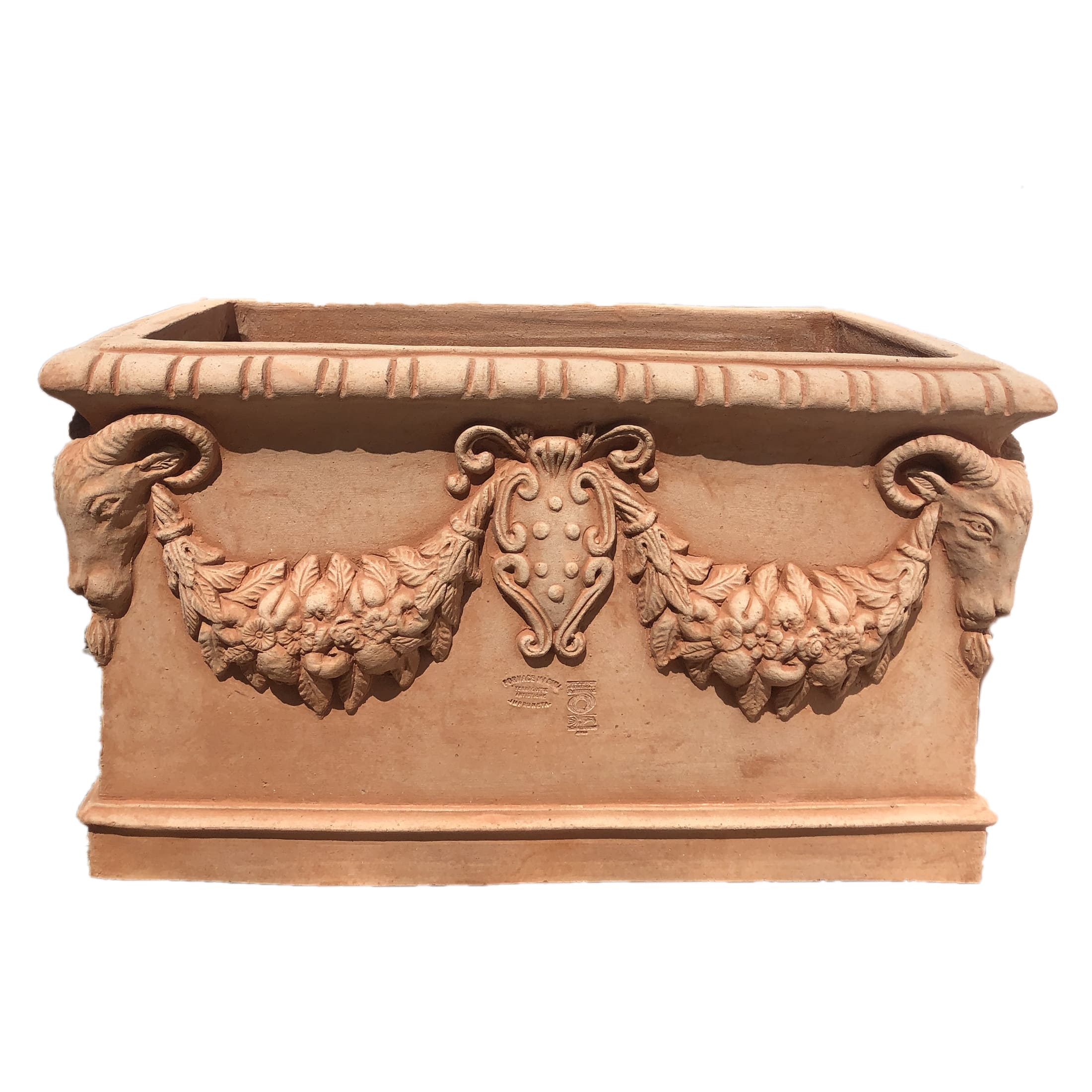 Der große barocke Blumenkasten aus Impruneta Terracotta ist ein eindrucksvolles Meisterwerk der Handwerkskunst. Seine imposante Größe und massive Struktur werden durch kunstvolle Verzierungen betont. In der Mitte des Kastens thront ein prächtiges Medici-Wappen, das von kunstvoll gefertigten Ranken umgeben ist. Diese Rankenmuster könnten detailreich gestaltet sein und das Medici-Wappen majestätisch umrahmen. An den Ecken des Blumenkastens sind kunstvoll gearbeitete Widderköpfe angebracht, die dem Kasten zusätzlichen Charakter und eine königliche Ausstrahlung verleihen. Diese Verzierungen sind wahrscheinlich mit großer Sorgfalt und Präzision von Hand gefertigt worden, um die Schönheit und Pracht des barocken Designs zu unterstreichen. Die Verwendung von Impruneta Terracotta, bekannt für ihre Langlebigkeit und Frostbeständigkeit, macht diesen massiven Blumenkasten nicht nur zu einem ästhetischen Element, sondern auch zu einem funktionalen Gefäß für Pflanzen im Außenbereich. Dieser großartige barocke Blumenkasten aus Impruneta Terracotta ist ein wahrhaft königliches Stück für Gärten, Anwesen oder großflächige Außenbereiche. Seine kunstvolle Verzierung mit dem Medici-Wappen, den Ranken und den Widderköpfen macht ihn zu einem eindrucksvollen und majestätischen Element für Liebhaber von historischer Symbolik und kunstvoller Gestaltung.