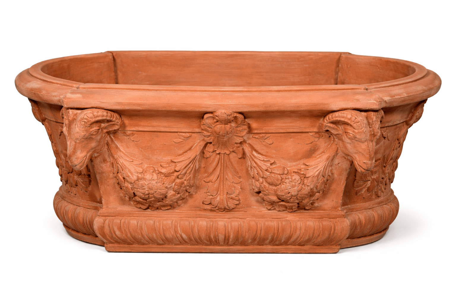 Die Außenseiten des Blumenkastens sind reich verziert mit detailgetreu gearbeiteten Widderköpfen, die dem Gefäß eine majestätische, kraftvolle Ausstrahlung verleihen. Diese Widderköpfe sind ein typisches Element barocker Gestaltung und machen den Terracotta Blumenkasten zu einem einzigartigen Blickfang. Entlang der Kanten ziehen sich kunstvolle Blumen- und Obstranken, die dem Pflanzgefäß eine lebendige und üppige Optik verleihen und die hohe handwerkliche Qualität unterstreichen.