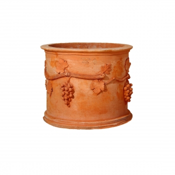 Terracottacylinder aus Impruneta mit kunstvoll reliefierten Weinreben verziert. Der runde Zylinder Pflanztopf überzeugt durch zeitlos mediterranes Design und hochwertige Handarbeit. Jeder Terracotta Kübel wird traditionell aus original Impruneta-Erde gefertigt und erhält dadurch individuelle Ausstrahlung, natürliche Wärme und authentischen Charme für Garten, Terrasse, Balkon und Innenbereich.