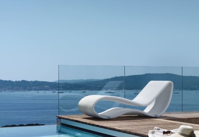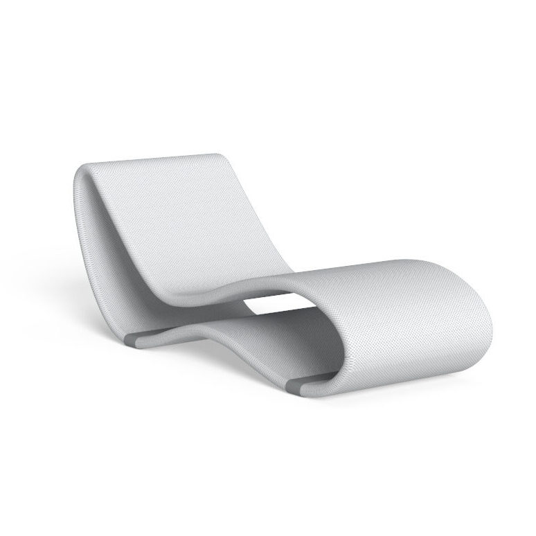 Design-Sonnenliege aus weiß lackiertem Aluminium und weißem Microfeel-Gewebe bespannt, das leicht zu reinigen und witterungsbeständig ist.