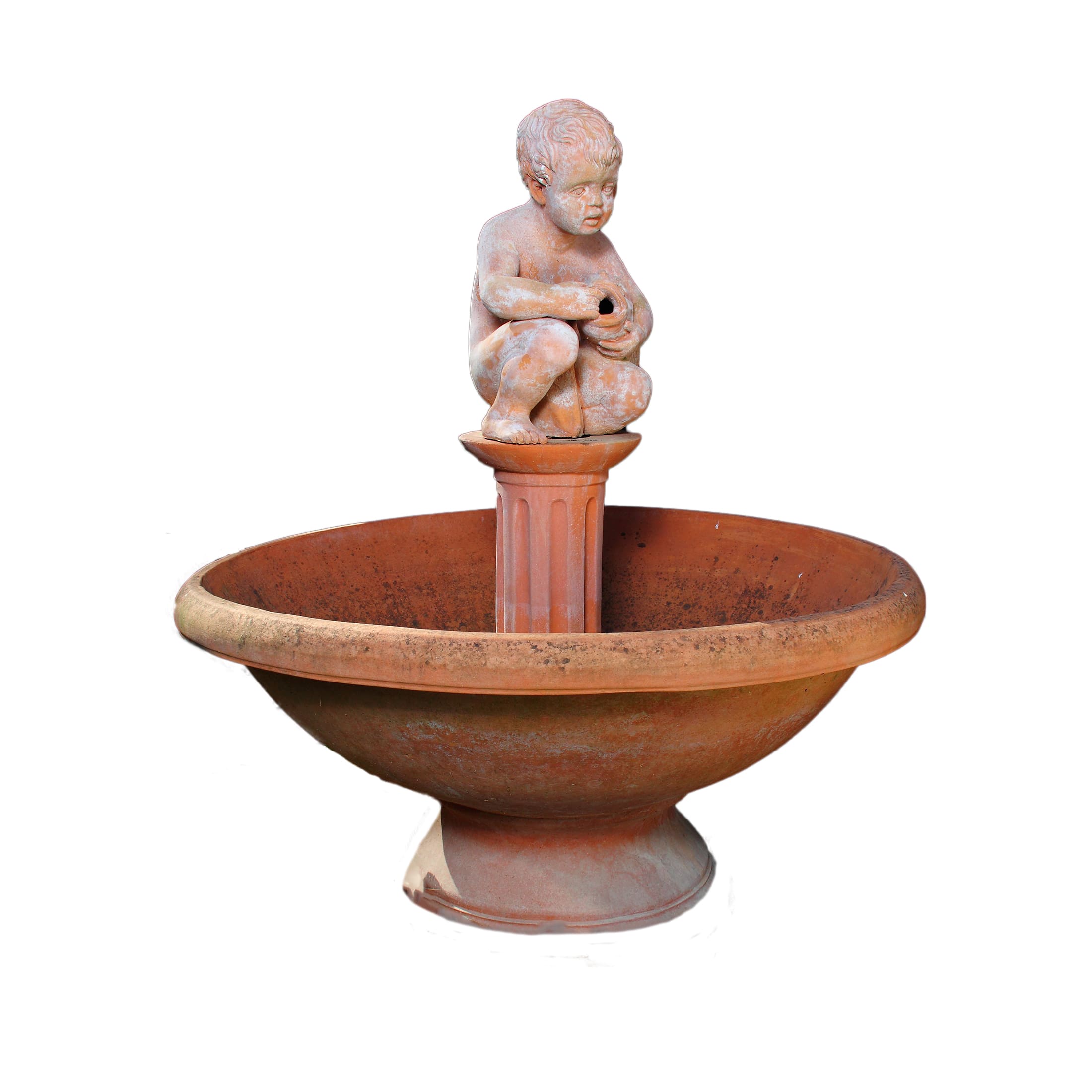 Ein runder Terracottabrunnen aus Impruneta ist ein Meisterwerk der Handwerkskunst und ein atemberaubendes Beispiel für traditionelle toskanische Gartenarchitektur. Die Hauptstruktur des Brunnens besteht aus Terracotta, einem robusten und gleichzeitig eleganten Material, das für seine Haltbarkeit und Schönheit bekannt ist. Der Brunnen hat eine imposante, große Schale in deren Mitte sich eine kannellierte Säule aus Terracotta erhebt. Diese Säule ist perfekt geformt und mit Rillen verziert, die dem Brunnen eine zusätzliche dimensionale Textur verleihen. Auf der Spitze dieser Säule sitzt ein zierlicher Putte, der verspielt und anmutig aussieht. Der Putte ist meisterhaft modelliert und trägt zur Lebendigkeit und Eleganz des Brunnens bei. Der Brunnen zieht nicht nur aufgrund seiner funktionalen Eigenschaften, sondern auch wegen seiner ästhetischen Schönheit die Aufmerksamkeit auf sich. Er ist nicht nur eine Quelle der Entspannung, sondern auch ein beeindruckendes Kunstwerk, das jeden Garten oder Innenhof schmückt.