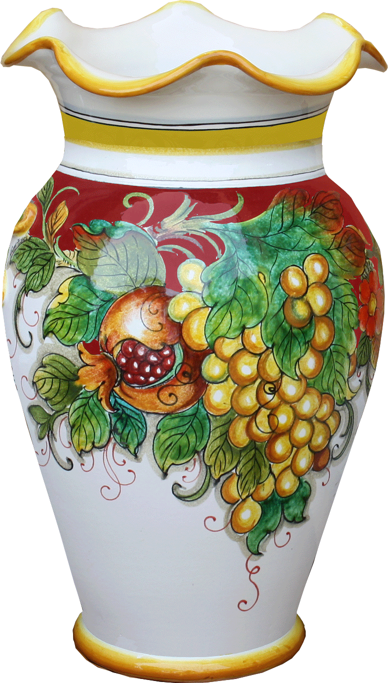 Die große italienische Bodenvase, verziert mit Granatäpfeln und Trauben auf einem Hintergrund aus roten und weißen Farbtönen, ist ein wahrer Blickfang und Ausdruck der reichen Tradition italienischer Keramikkunst. Die strahlenden Farben der Früchte, kombiniert mit dem Kontrast zwischen dem roten und weißen Hintergrund, verleihen der Vase eine lebendige und ansprechende Ästhetik. Die elegante Form der Vase ist sowohl ästhetisch ansprechend als auch funktional gestaltet. Der gewellte Rand am oberen Abschluss der Vase bietet nicht nur eine elegante Verzierung, sondern auch eine praktische Unterstützung für große Blumensträuße. Diese Gestaltung ermöglich Insgesamt strahlt diese Bodenvase eine zeitlose Schönheit und Eleganz aus, die sowohl in klassischen als auch modernen Einrichtungen beeindruckend wirkt. Sie verkörpert die Fülle der Natur und die Freude am mediterranen Lebensstil, und wird sicherlich jeden Raum, in dem sie platziert ist, aufwerten und bereichern.