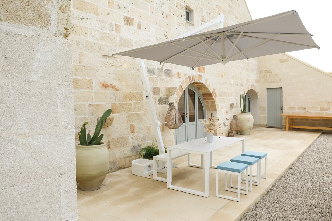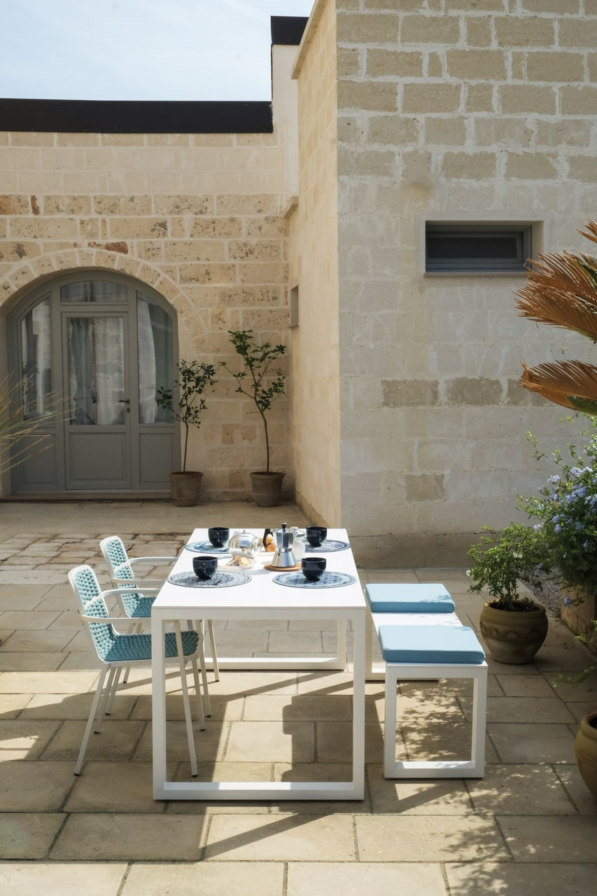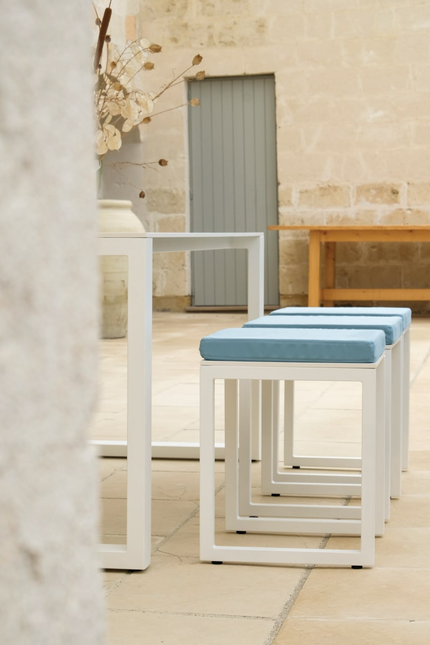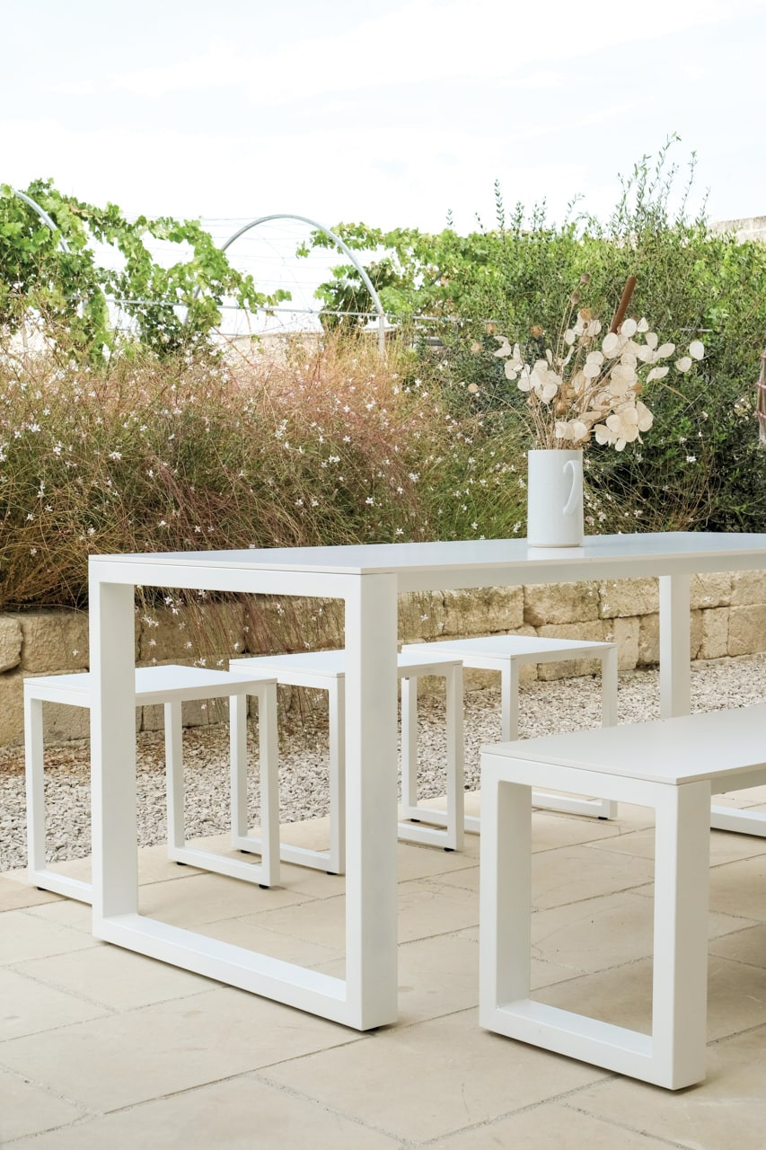 Eine leichte Struktur in hellen Tönen zeichnet diese maßgefertigte Bank aus, die auch als quadratische Rohrhocker zu bestellen ist und durch weiche Kissen aufgelockert wird.