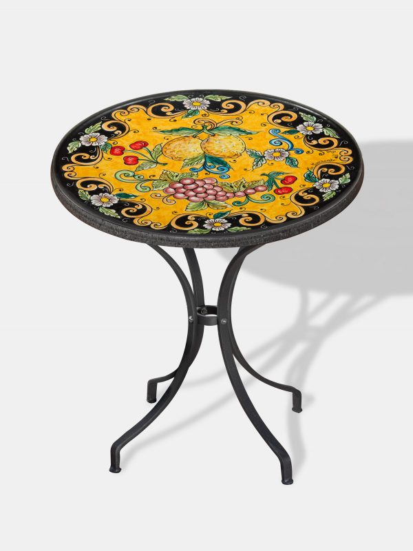 Der Gartentisch aus Sizilien, gefertigt aus strapazierfähigem Lavastein und eleganten schmiedeeisernen Füßen, ist ein wahres Meisterwerk der Handwerkskunst. Die Tischplatte ist ein lebendiges Kunstwerk, das die reiche Landwirtschaft und die üppige Natur Siziliens feiert. Auf einem dunklen Hintergrund sind sorgfältig gemalte Trauben und Zitronen in lebendigen Farben zu sehen, die die Tischplatte mit natürlicher Schönheit überziehen.