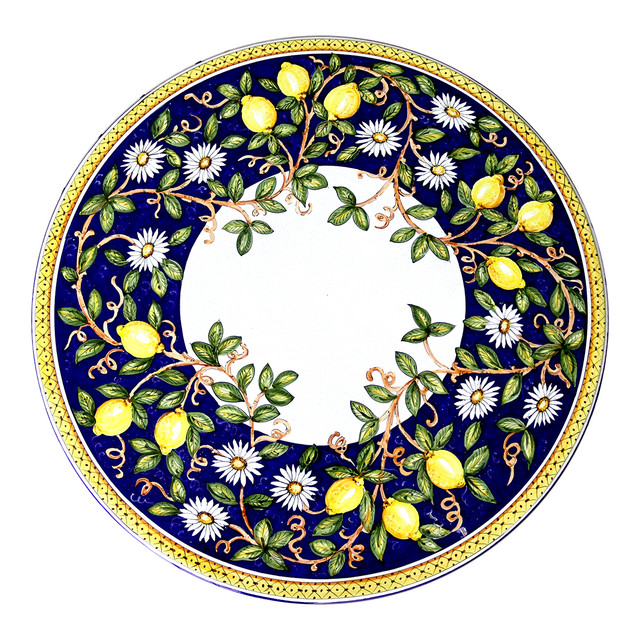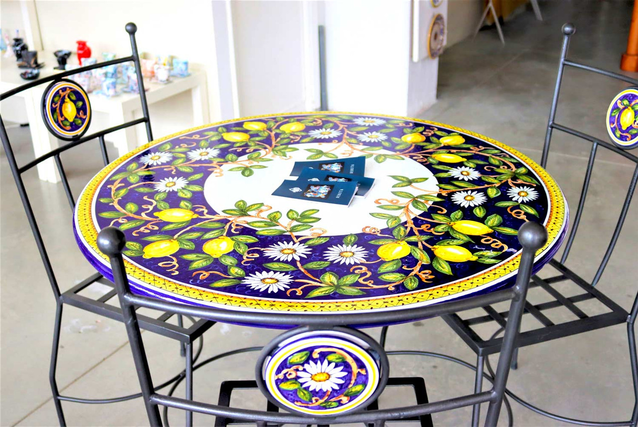 Der bunte Keramiktisch aus Deruta, gefertigt aus feinster handbemalter Majolika, ist ein beeindruckendes Beispiel italienischer Handwerkskunst. Seine runde Form und die kunstvolle Bemalung verleihen ihm eine zeitlose Eleganz, die jeden Raum oder Außenbereich bereichert. Das Design zeigt verschlungene Zitronenranken, deren leuchtendes Gelb und frisches Grün Lebendigkeit und mediterrane Wärme ausstrahlen. Ergänzt wird dieses Motiv durch zarte Margeritenblüten, die mit ihren weißen Blütenblättern und goldenen Akzenten einen charmanten Kontrast schaffen. Der Hintergrund in tiefem Dunkelblau und reinem Weiß unterstreicht die leuchtenden Farben der handgemalten Muster und verleiht dem Tisch eine harmonische Ausstrahlung. Robust und wetterbeständig eignet sich dieses Unikat für drinnen und draußen gleichermaßen und ist in verschiedenen Größen erhältlich, um unterschiedliche Bedürfnisse und Räumlichkeiten perfekt zu ergänzen. Dieses Meisterwerk verbindet Ästhetik, Tradition und Funktionalität zu einem echten Symbol italienischer Lebensart.
