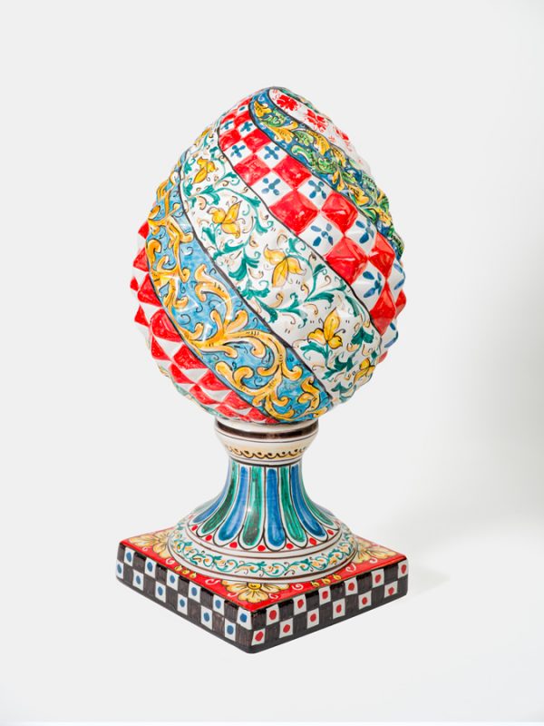 Bunter Pinienzapfen mit verziertem Fuß, handgefertigt aus Sizilien. Handarbeit nach jahrhundertealter Tradition, mit leuchtenden Emaillen bemalt..