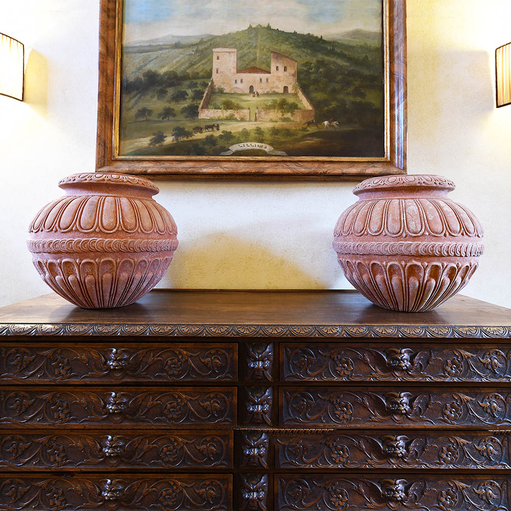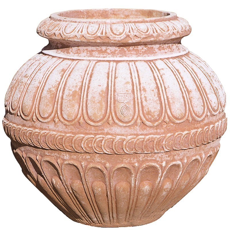 Reich ornamentierter bauchiger Terracottatopf mit antiker Kannellierung.