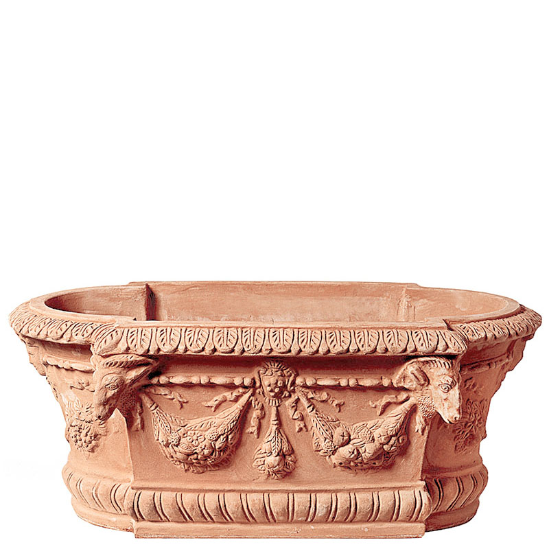 Massiver, geschwungener, rechteckiger und reich verzierter Terracottakasten.