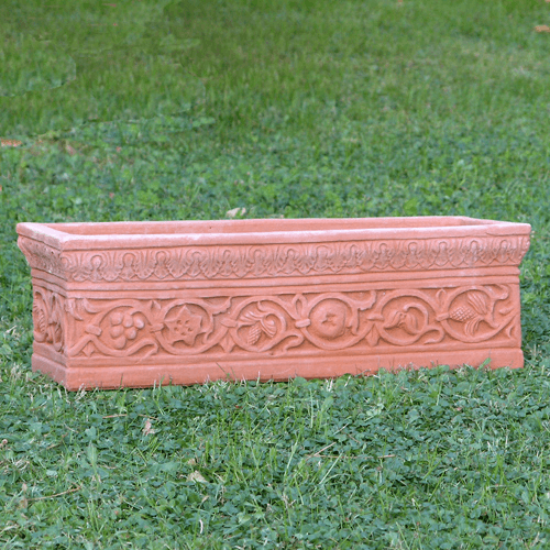 Reich verzierter Blumenkasten aus Impruneta. Das byzantinische florale Dekor ist als Relief durch Handarbeit herausgearbeitet.
