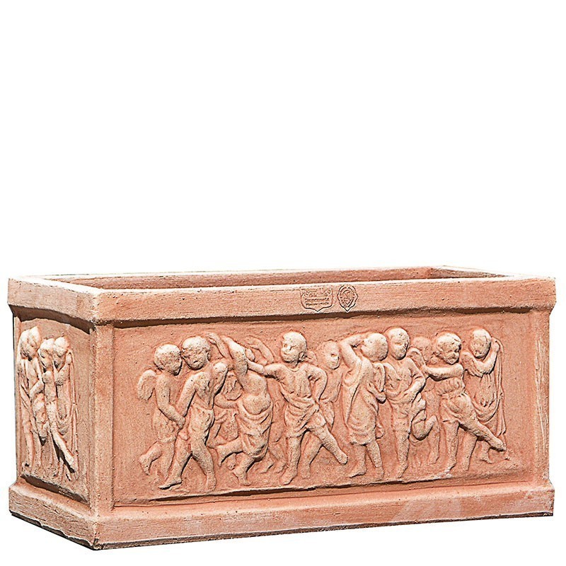 Rechteckiger und mit einem Puttenrelief reich verzierter Terracottakasten aus Impruneta.