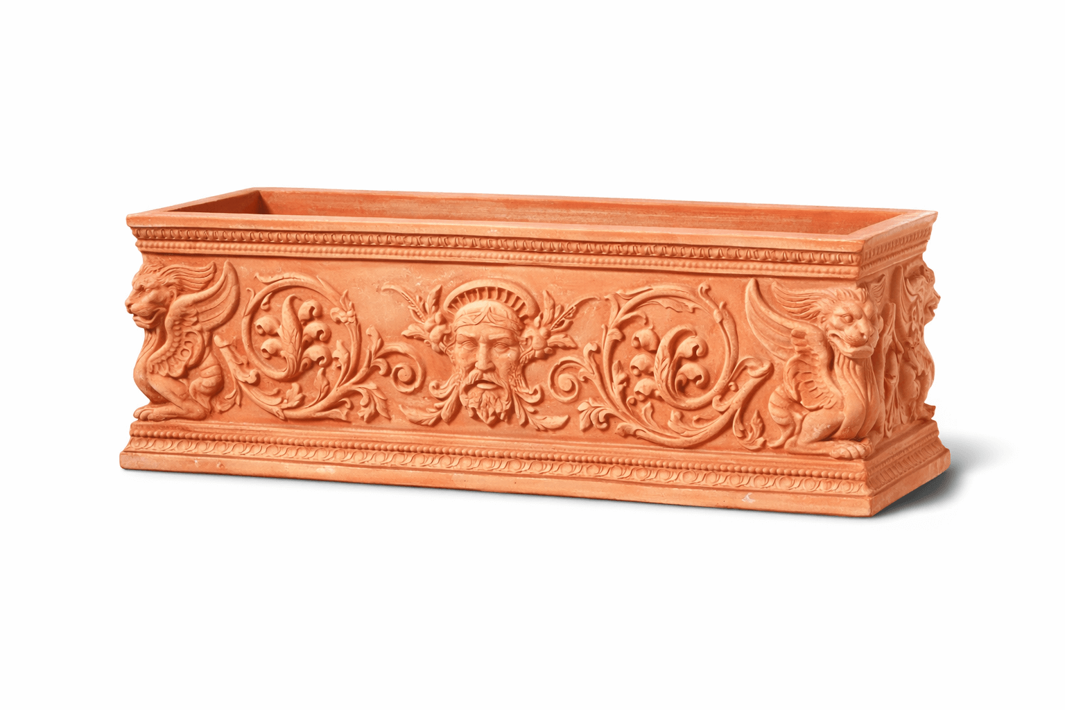 Dieser rechteckige Terracottakasten aus Impruneta vereint traditionelle Handwerkskunst mit mediterraner Eleganz. Reich verziert mit kunstvollen Ornamenten und charakteristischen Sphinxsymbolen (Sfingi), ist dieser Blumenkasten ein stilvolles Highlight für Garten, Terrasse oder Balkon.