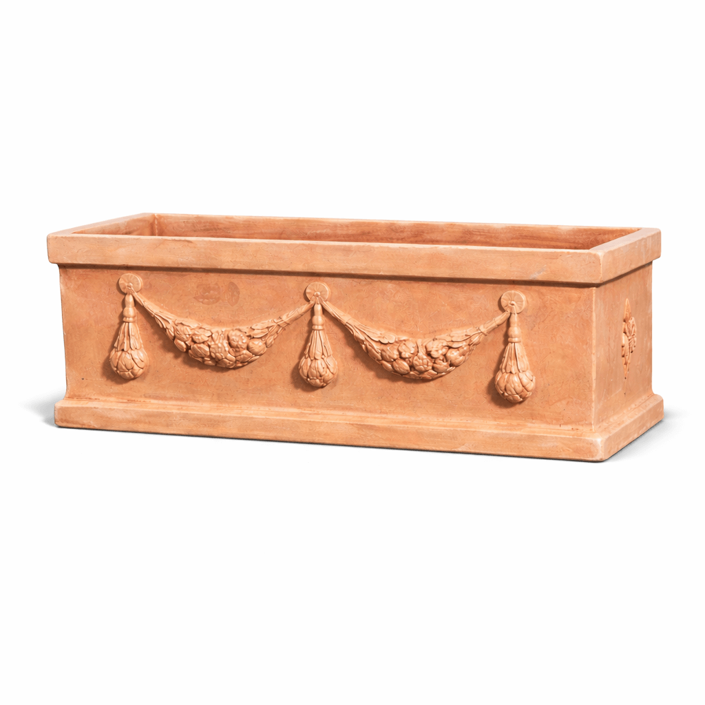 An den schmalen Außenseiten ist der Terracottakasten mit der florentinischen Lilie geschmückt – einem traditionellen Symbol der Toskana, das für Eleganz und Geschichte steht. Die feinen Reliefarbeiten unterstreichen die exklusive Optik dieses besonderen Pflanzgefäßes.