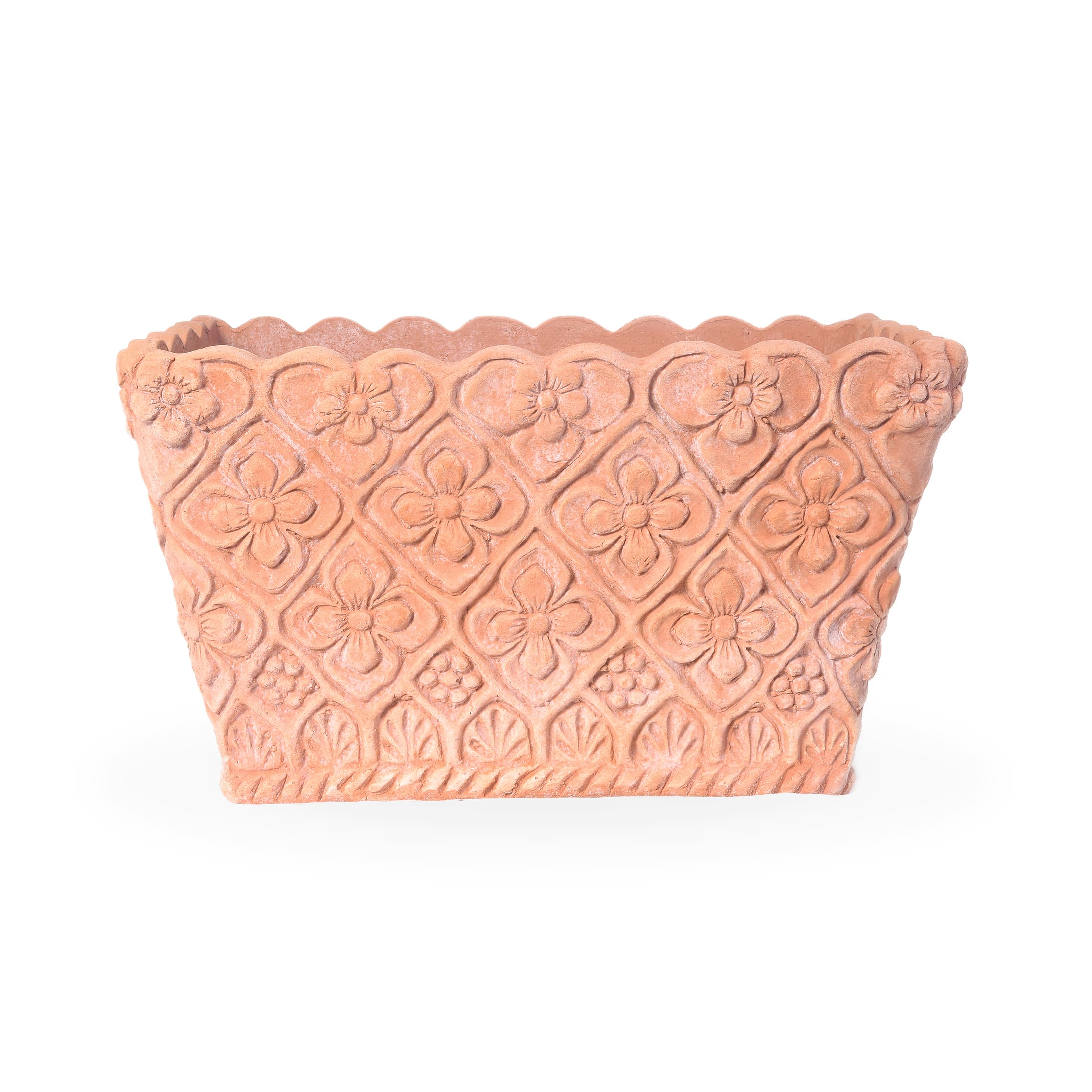 Reich verzierter Blumenkasten aus Impruneta. Das florale Dekor ist als Relief durch Handarbeit herausgearbeitet.