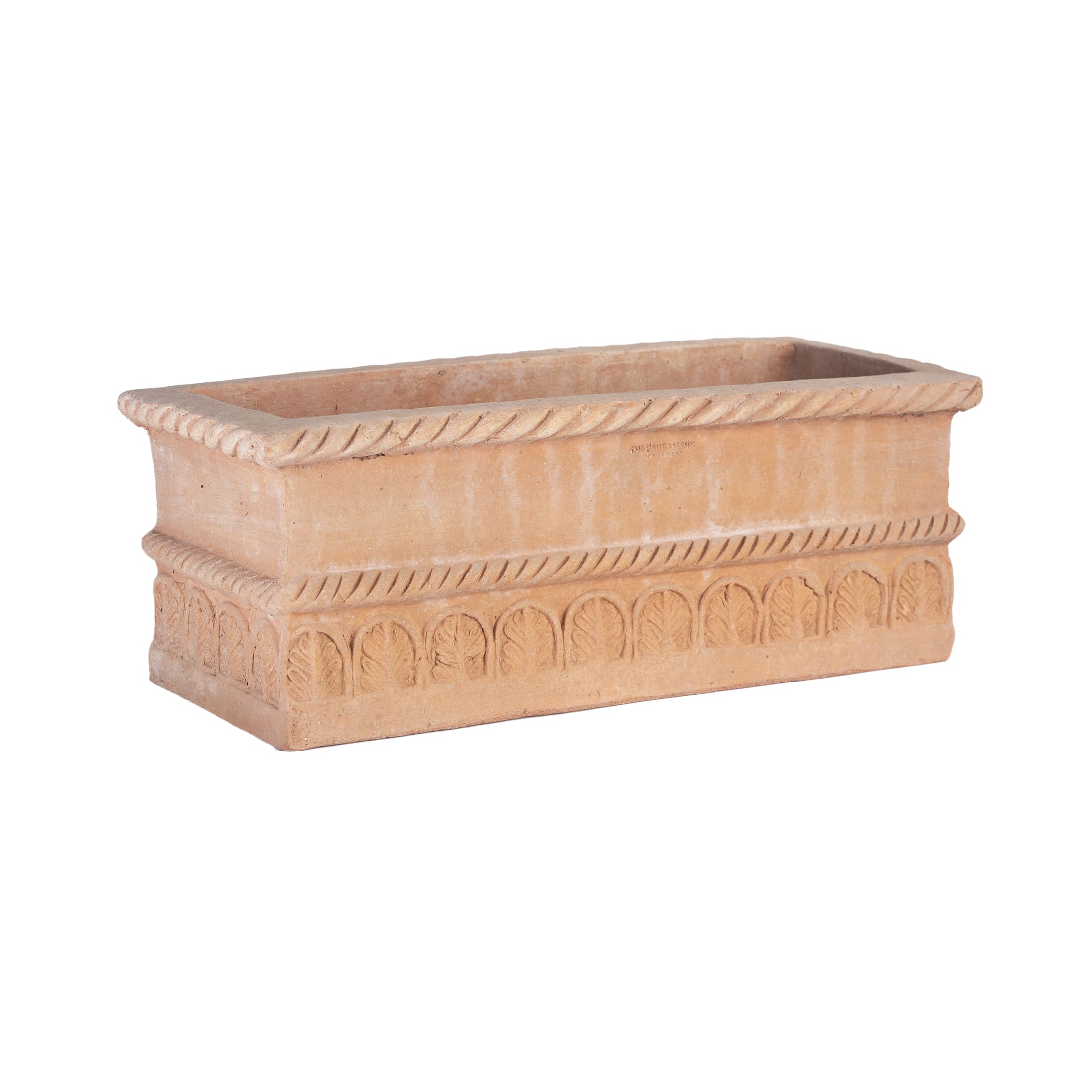 Dieser hochwertige Terracottakasten aus Impruneta überzeugt durch seine schlichte rechteckige Form und ein reich verziertes, antikes Muster. Das Pflanzgefäß verbindet zeitlose Eleganz mit robuster Qualität und eignet sich ideal für Blumen, Kräuter und Zierpflanzen im Innen- und Außenbereich.