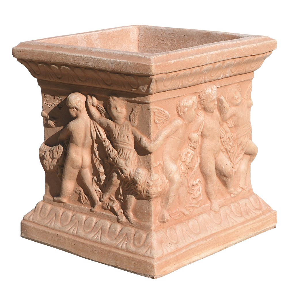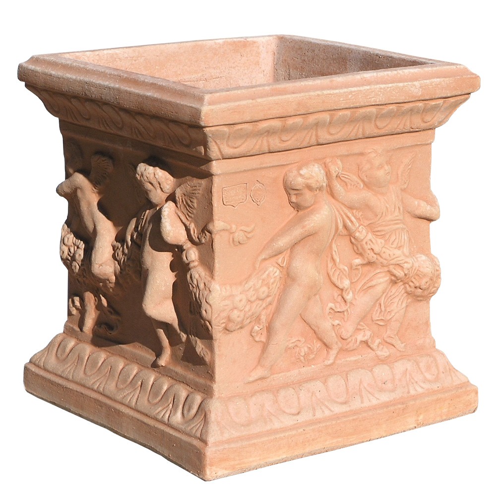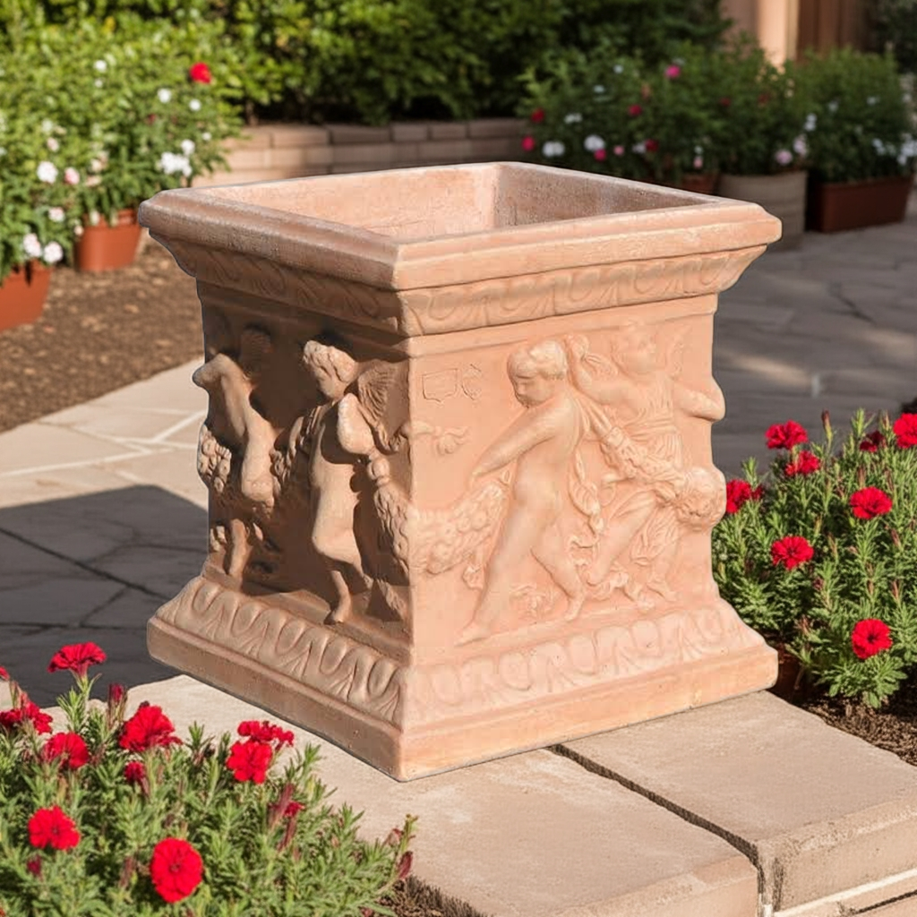 Ein quadratischer Terracotta-Kasten, verziert mit tanzenden Putten, präsentiert sich als kunstvolles Behältnis, handgearbeitet und frostbeständig. Die klaren Linien und die quadratische Form des Kastens bieten eine solide Grundlage für die kunstvolle Verzierung. Die Putten, kleine Engelsfiguren, sind in lebendigen und verspielten Posen dargestellt, wie sie umherwirbeln oder tänzerische Bewegungen ausführen. Ihre Darstellung verleiht dem Kasten eine lebhafte und verspielte Atmosphäre, die von ihrer Anmut und Leichtigkeit lebt. Die Handwerkskunst, die in die Gestaltung und Ausführung der Putten eingeflossen ist, zeigt sich in den feinen Details ihrer Flügel, Gesichter und Körperhaltungen. Diese Elemente tragen zur Schönheit und Einzigartigkeit des Kastens bei. Die Verwendung von Terracotta gewährleistet nicht nur die Frostbeständigkeit des Kastens, sondern verleiht ihm auch eine rustikale und natürliche Ästhetik. Diese Eigenschaften machen ihn zu einer idealen Wahl für den Außenbereich, da er den Elementen widerstehen kann, während er gleichzeitig ein attraktives gestalterisches Element darstellt. Insgesamt repräsentiert der quadratische Terracotta-Kasten mit den tanzenden Putten eine Kombination aus kunstvoller Handwerkskunst und Funktionalität, die gleichermaßen als dekoratives Element im Freien oder im Innenbereich dienen kann.