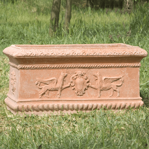 Massiver Terracottakasten, geschmückt mit venezianischen Dekor (Löwe und Wappen)