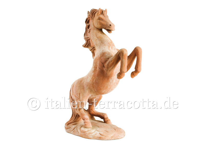 Dieses elegante Terracotta-Pferd, das sich aufbäumt und auf den Hinterbeinen steht, ist nicht nur ein Kunstwerk, sondern auch ein Symbol für Freiheit, Stärke und Schönheit. Seine Präsenz strahlt eine kraftvolle Energie aus und zieht die Betrachter in den Bann seiner majestätischen Schönheit.