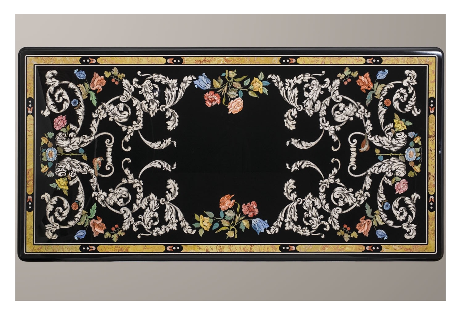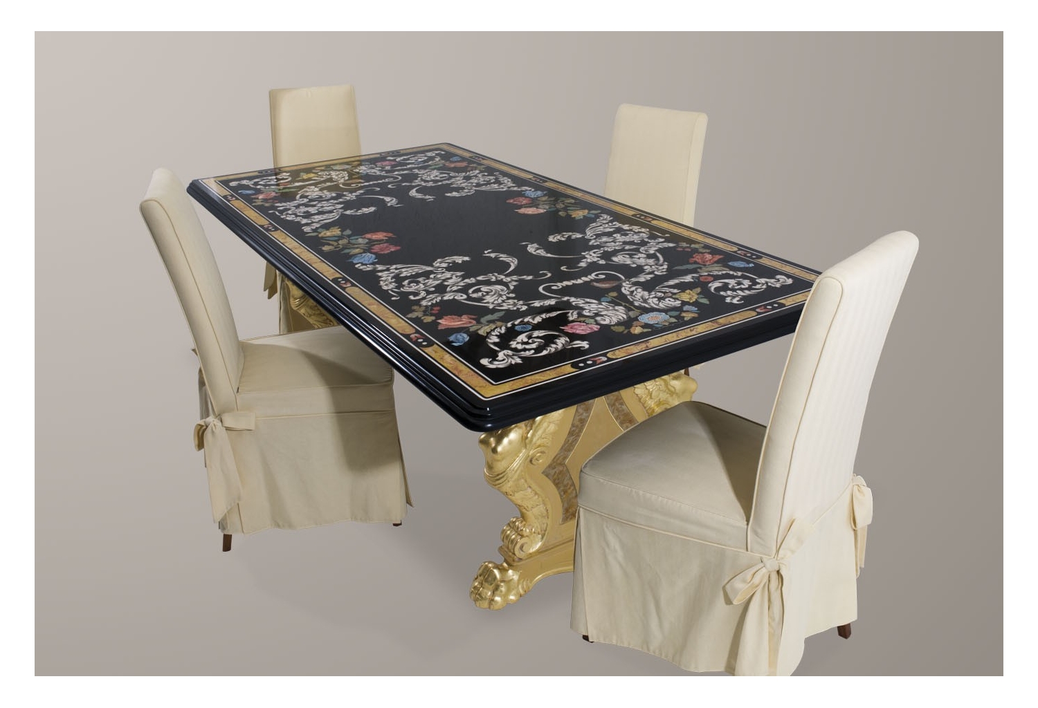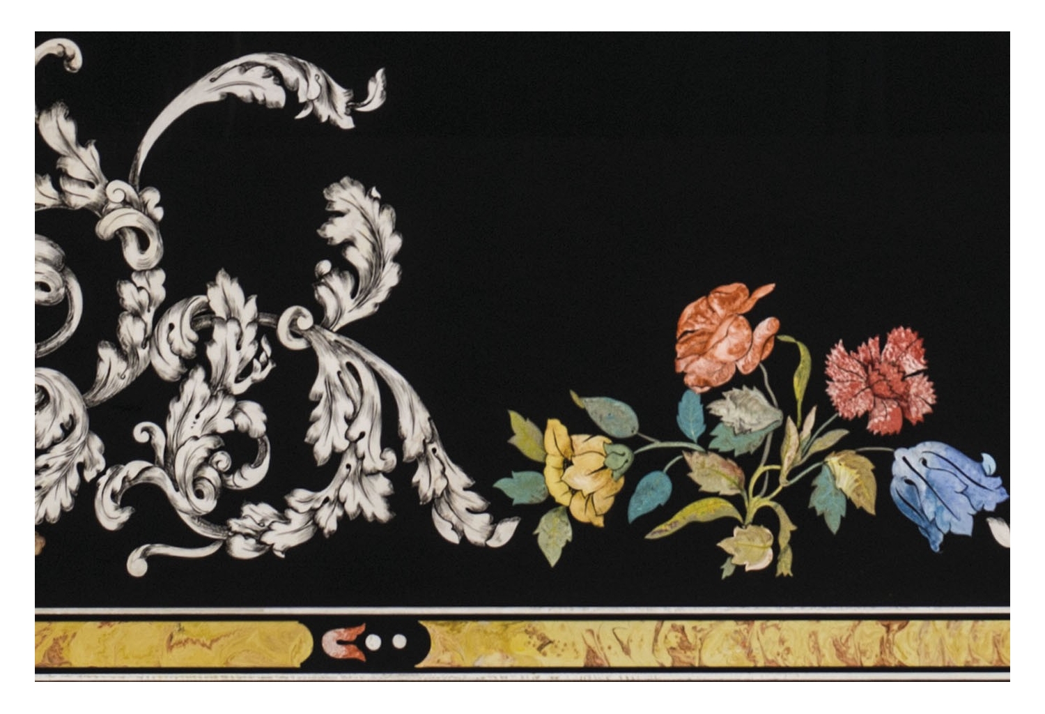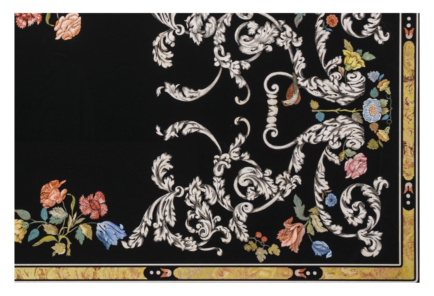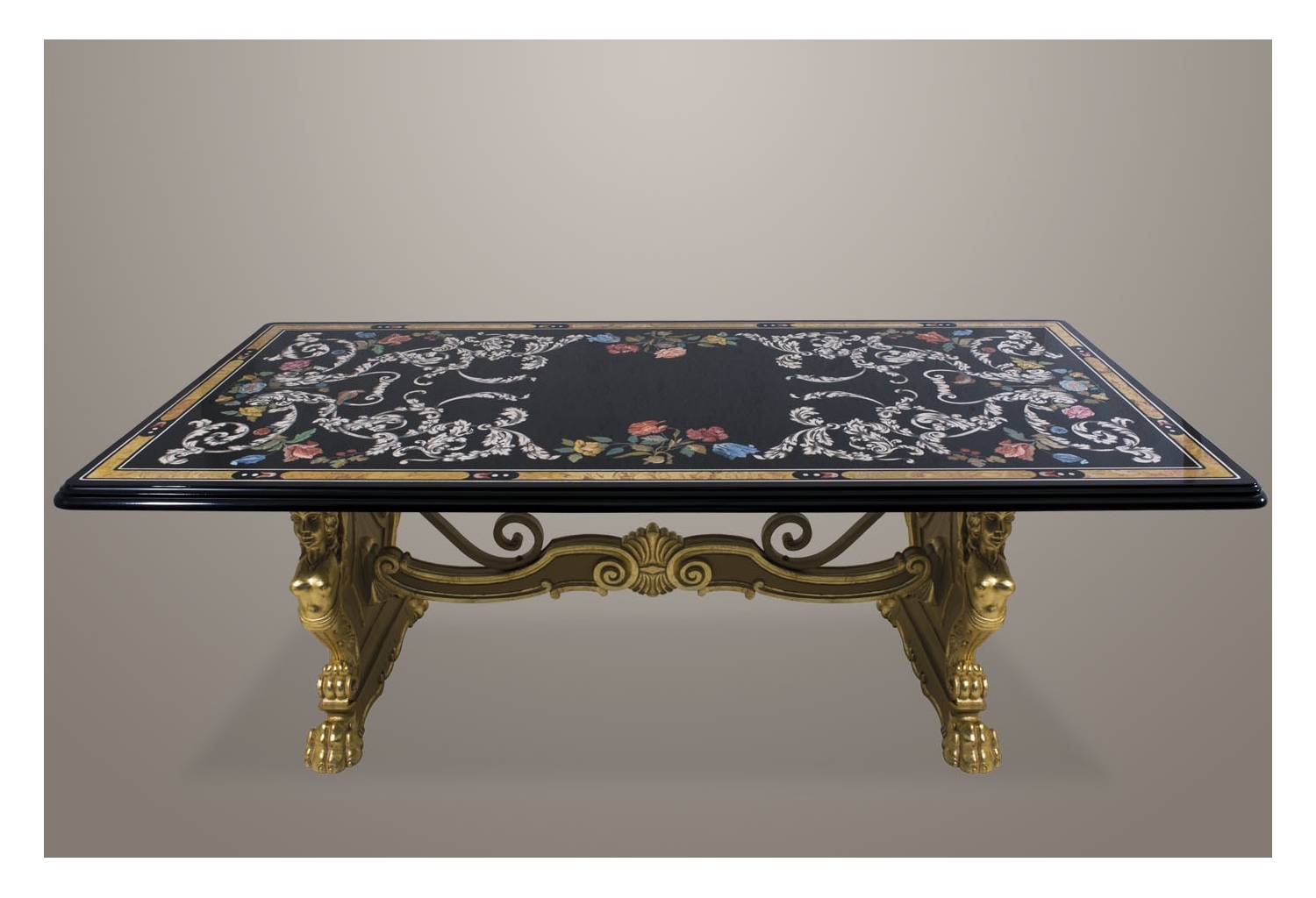 Esstisch mit schwarzer Marmorplatte und Scagliola Intarsien. Das Dekor stammt aus dem XVIII. Jahrhundert. Der Tischfuß besteht aus Holz, verziert mit Blattgold. Scagliola ist die antike Kunst, architektonische Elemente aus Stuck herzustellen, die wie Marmor aussehen. Diese Technik erlangte im 18. Jahrhundert in Florenz und Venedig einen hohen Bekanntheitsgrad. Hergestellt wird ein Marmorimitat, was mit farblich strahlenden Intarsien gefüllt wird. Somit entsteht eine schimmernde von innen heraus scheinende Wirkung, die strahlend bleibt.