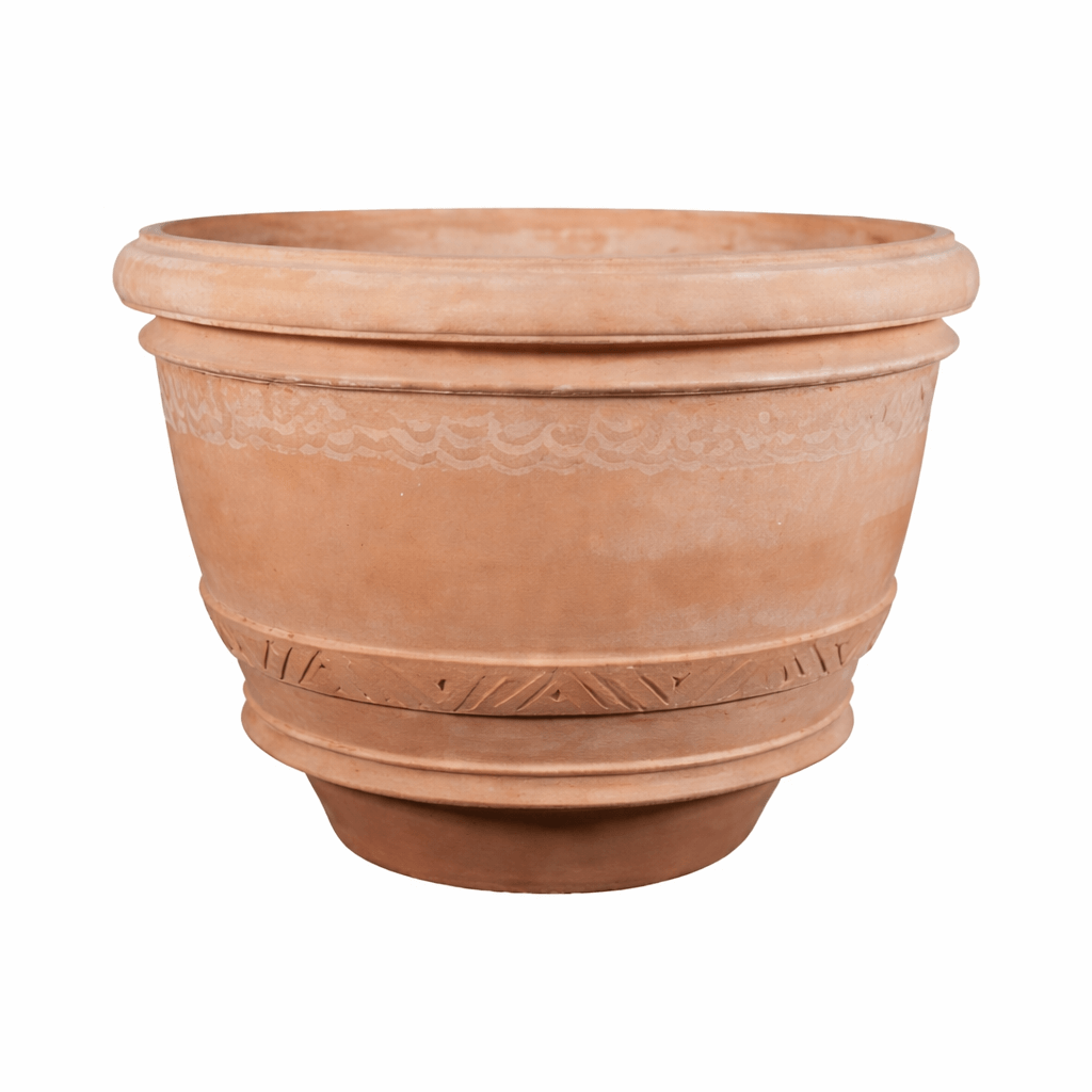 Der Terracotta-Topf Conca (italienisch für „Becken“) aus original Impruneta Terracotta vereint klassische Schlichtheit mit feiner handwerklicher Raffinesse. Seine klare, gerade Form verleiht ihm eine ruhige, harmonische Ausstrahlung, während die kleinen, eingeritzten Muster – inspiriert vom etruskischen Design – subtile Akzente setzen und an das antike Handwerk der Toskana erinnern.