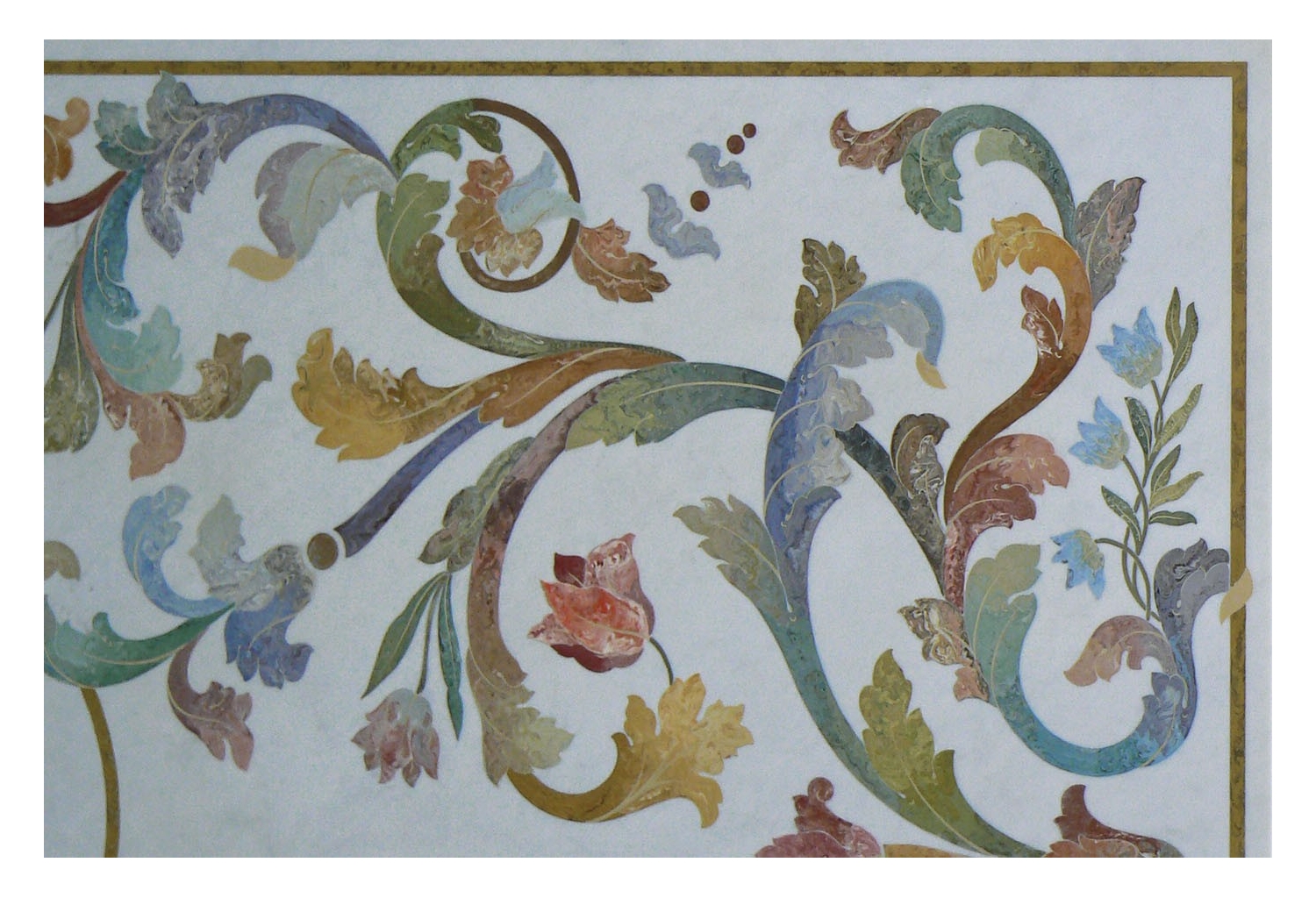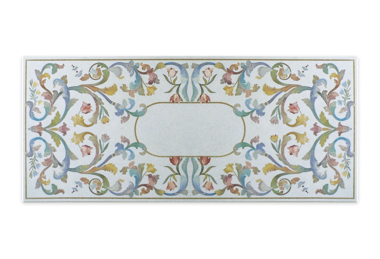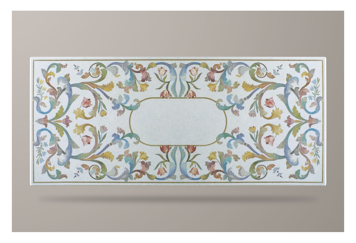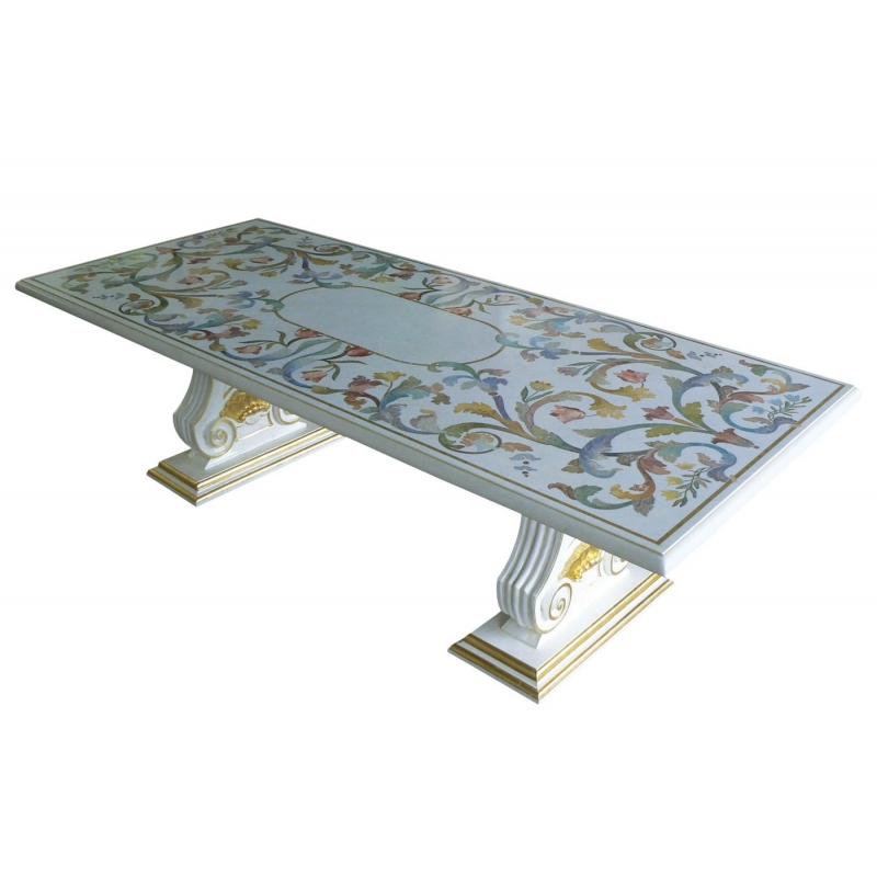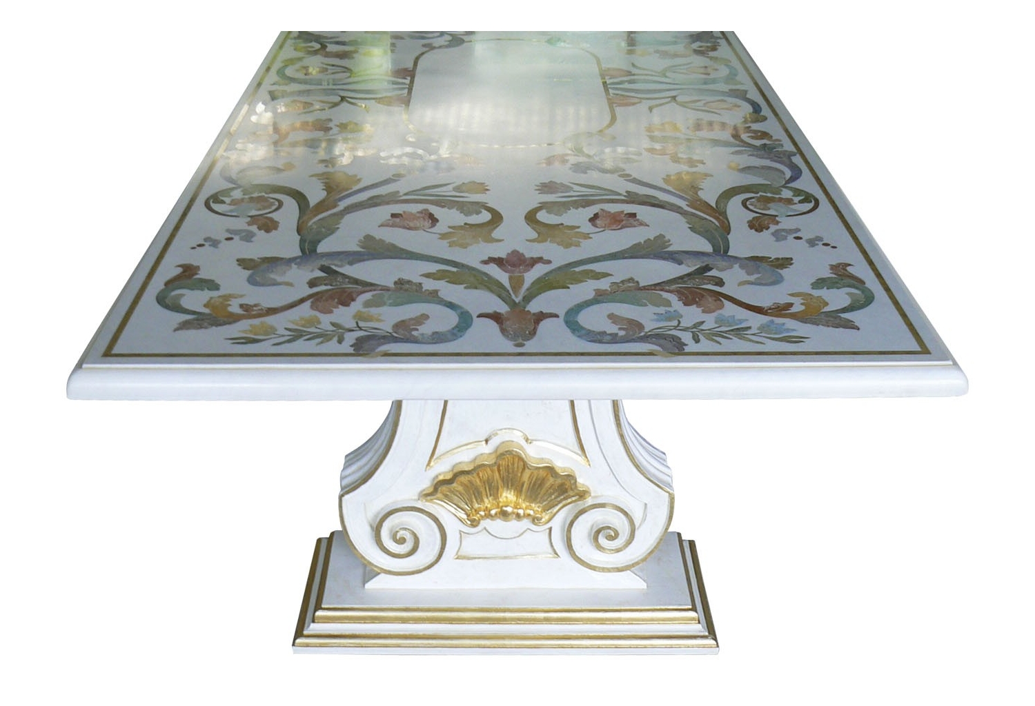 Esstisch mit strahlend weißer Marmorplatte und polychromen Scagliola Intarsien. Der Tischfuß besteht aus Holz, verziert mit edlem Blattgold. Das Dekor der Dafne besteht aus Voluten mit ineinander verflochtenen Blättern und Blüten. Scagliola ist die antike Kunst, architektonische Elemente aus Stuck herzustellen, die wie Marmor aussehen. Diese Technik erlangte im 18. Jahrhundert in Florenz und Venedig einen hohen Bekanntheitsgrad. Hergestellt wird ein Marmorimitat, was mit farblich strahlenden Intarsien gefüllt wird. Somit entsteht eine schimmernde von innen heraus scheinende Wirkung, die langfristig strahlend bleibt.
