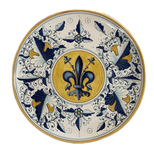 Der handbemalte Keramik-Teller aus der Toskana zeigt eine prächtige Darstellung der berühmten blauen florentinischen Lilie, die majestätisch in der Mitte des Tellers auf einem warmen senfgelben Hintergrund thront. Die Lilie ist kunstvoll gemalt, ihre königliche Blüte und die feinen Details der Blätter und Stängel sind mit meisterhafter Präzision eingefangen. Um die Lilie herum erstreckt sich eine florale Dekoration in weiß und Blau, geschwungen und kunstvoll gestaltet. Die Linien und Kurven der Dekoration fließen elegant und verleihen dem Teller eine gewisse Anmut und Raffinesse. Die Blumenmuster könnten verschiedene Blüten und Ranken umfassen, die den zentralen Fokus der Lilie umgeben und ihre Schönheit unterstreichen. Der senfgelbe Hintergrund verleiht dem Teller eine warme und einladende Atmosphäre, während die blauen und weißen Verzierungen einen Hauch von Eleganz und Tradition hinzufügen. Jeder Pinselstrich zeugt von der Kunstfertigkeit des Keramikmalers und fängt die Ästhetik der florentinischen Kunst und Kultur ein. Der Teller strahlt eine zeitlose Schönheit aus, die die Geschichte und das Erbe der Toskana verkörpert. Er erzählt die Geschichte von Eleganz, Tradition und der einzigartigen Blüte der florentinischen Lilie inmitten einer kunstvoll gestalteten Umgebung.