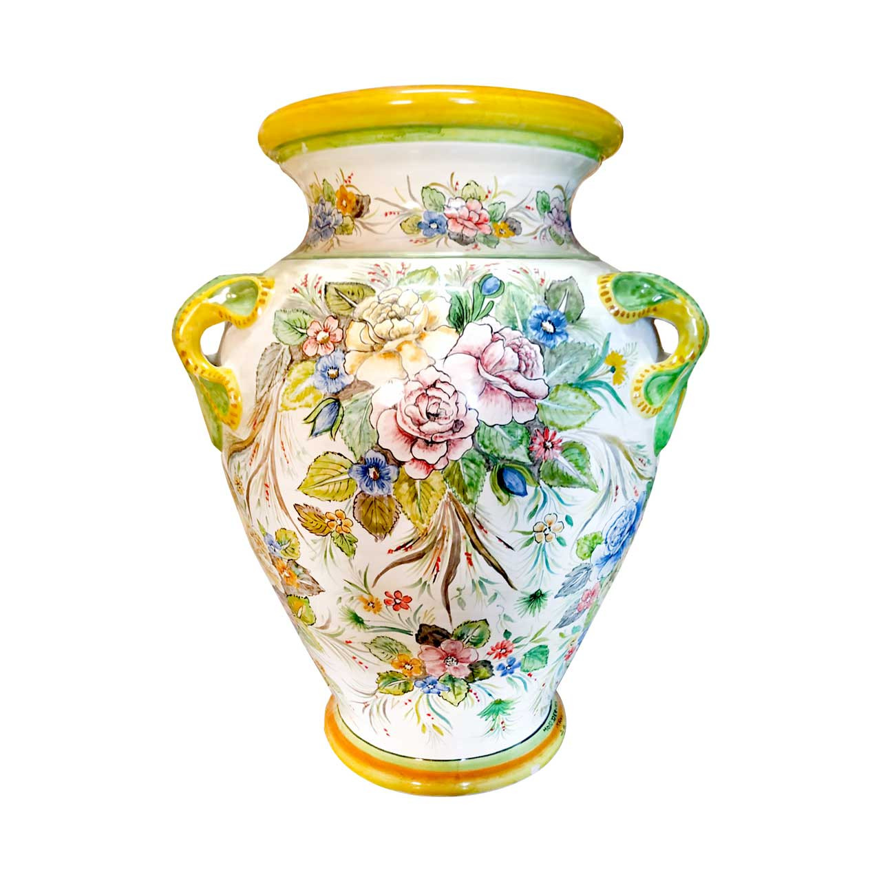 Ein markantes Detail sind die gelben Griffe und der ebenfalls gelbe obere Rand, die einen warmen Kontrast zu den vielschichtigen Farben der Blüten bilden. Die Vase verbindet meisterhaft traditionelle Handwerkskunst mit dekorativer Ästhetik und bringt mediterranes Flair in jeden Raum.
