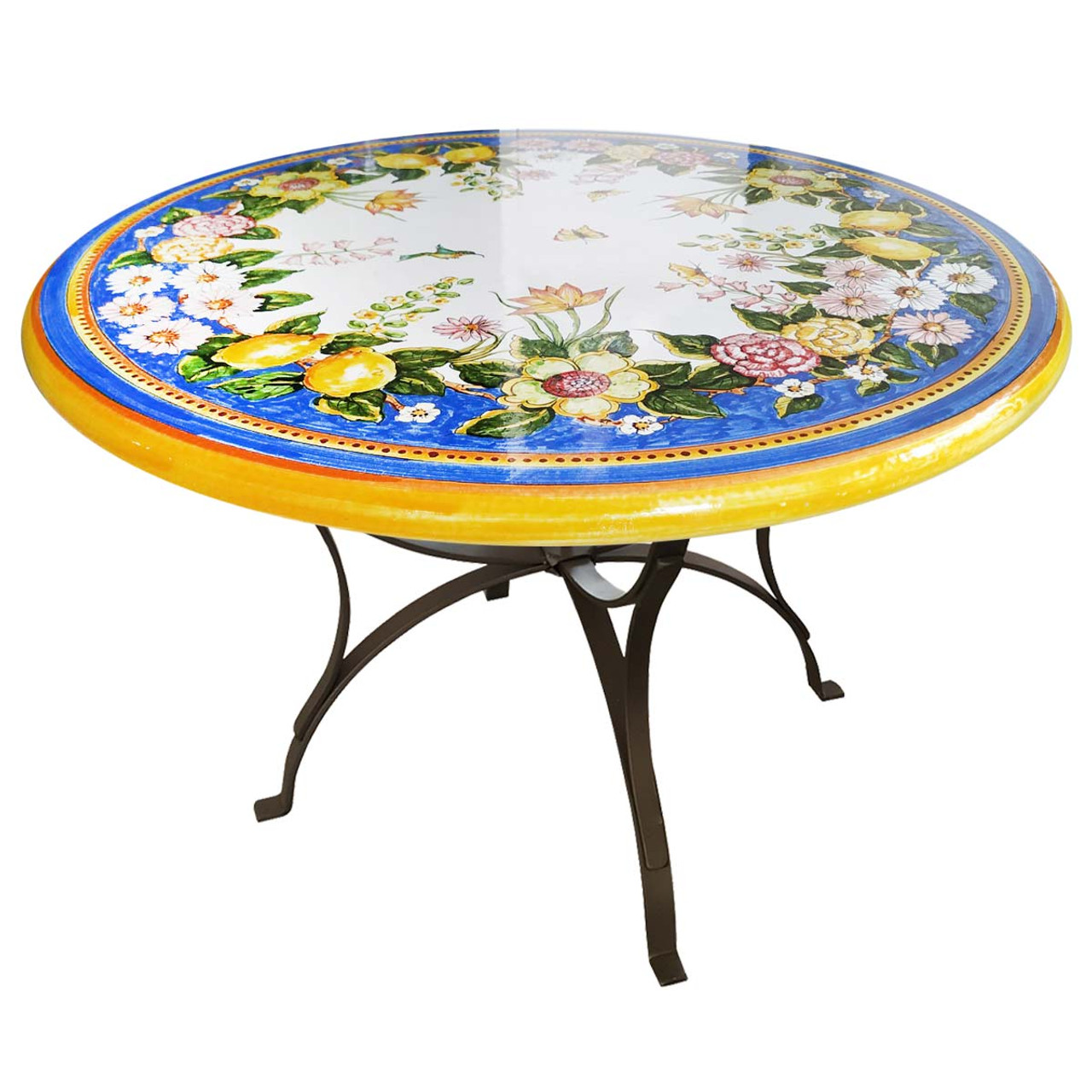 Das Design ist reich an lebhaften Blau-, Grün-, Gelb- und Rotnuancen, die harmonisch miteinander kombiniert sind. Diese Farben, charakteristisch für die umbrische Majolika, verleihen dem Tisch eine warme und einladende Ausstrahlung. Die Keramikoberfläche glänzt dank der aufwändigen Glasur und sorgt dafür, dass die Farben dauerhaft strahlend bleiben.