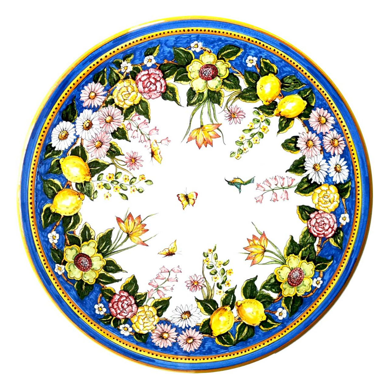 Die Tischplatte ist in leuchtenden Farben gestaltet, die typisch für die Region Umbrien sind. Sie zeigt ein bezauberndes Ensemble von Rosen in satten Rot- und Rosatönen, weißen Margeriten mit sonnengelben Zentren und leuchtend gelben Zitronen, die Frische und mediterranes Flair symbolisieren. Zarte Schmetterlinge, gemalt in feinen Details und schillernden Farben, verleihen dem Design Leichtigkeit und eine spielerische Note. All diese Elemente sind kunstvoll auf einem hellen, glasierten Untergrund arrangiert, der die Motive strahlen lässt.