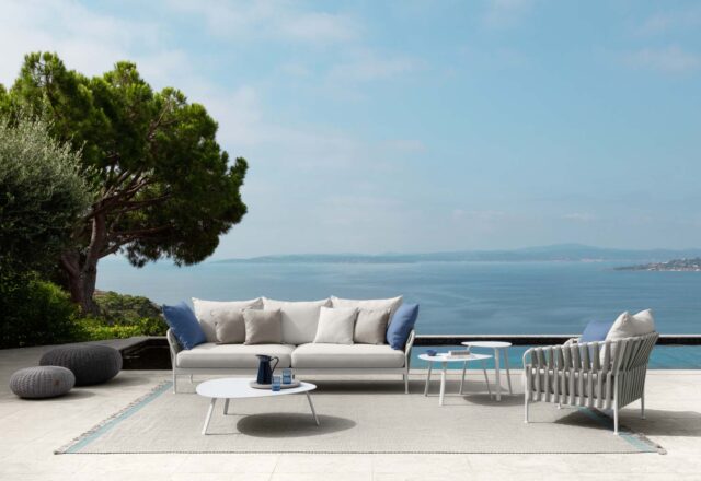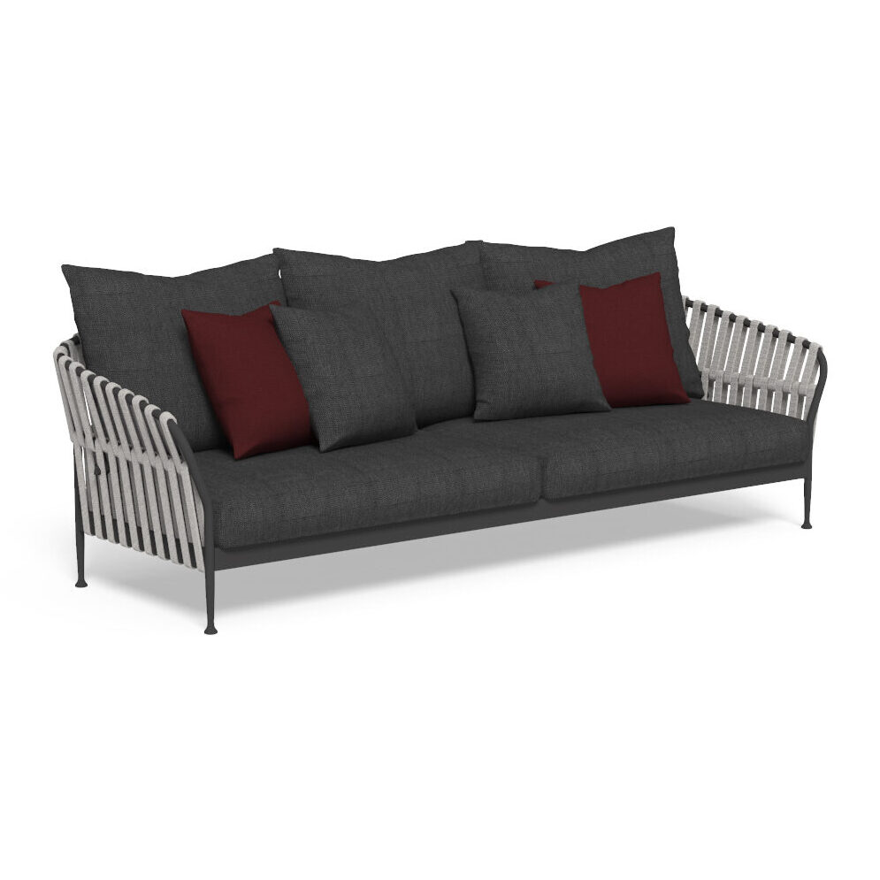 Die bequeme Sitzfläche des Living Frame Sofas ist perfekt, um den Aufenthalt im Freien zu genießen und ein Statement des guten Geschmacks. Die Aluminiumstruktur mit ihrer weichen und gewundenen Form passt perfekt zu den bequemen Kissen und den geflochtenen Textilseilen, die in die Struktur der Armlehnen und der Rückenlehne eingeflochten sind.