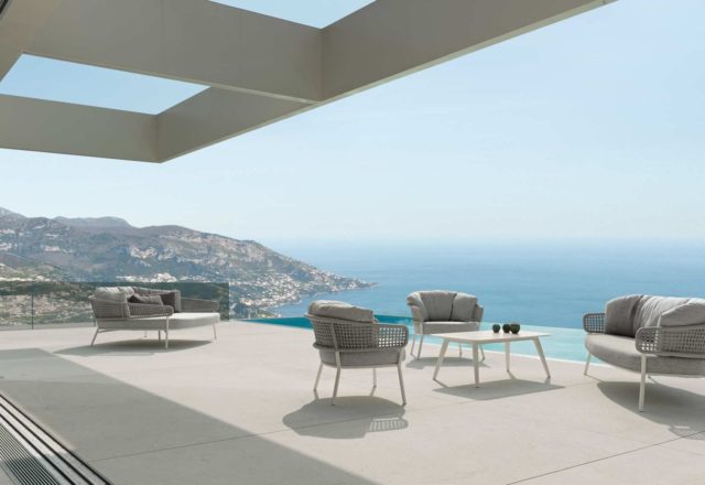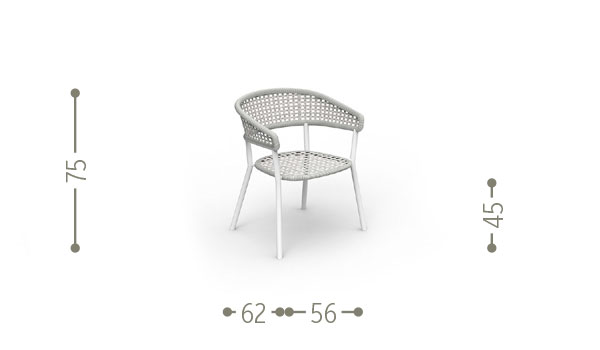 Die Struktur besteht aus Aluminium mit einem Geflecht aus Seilen in einem grauen synthetischen Stoff bedeckt. Kissen mit abnehmbarem Stoff, leicht zu waschen und witterungsbeständig. Schnell trocknende Schaumstoffpolsterung.
