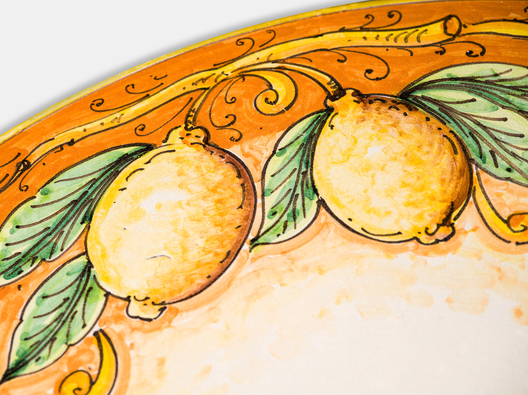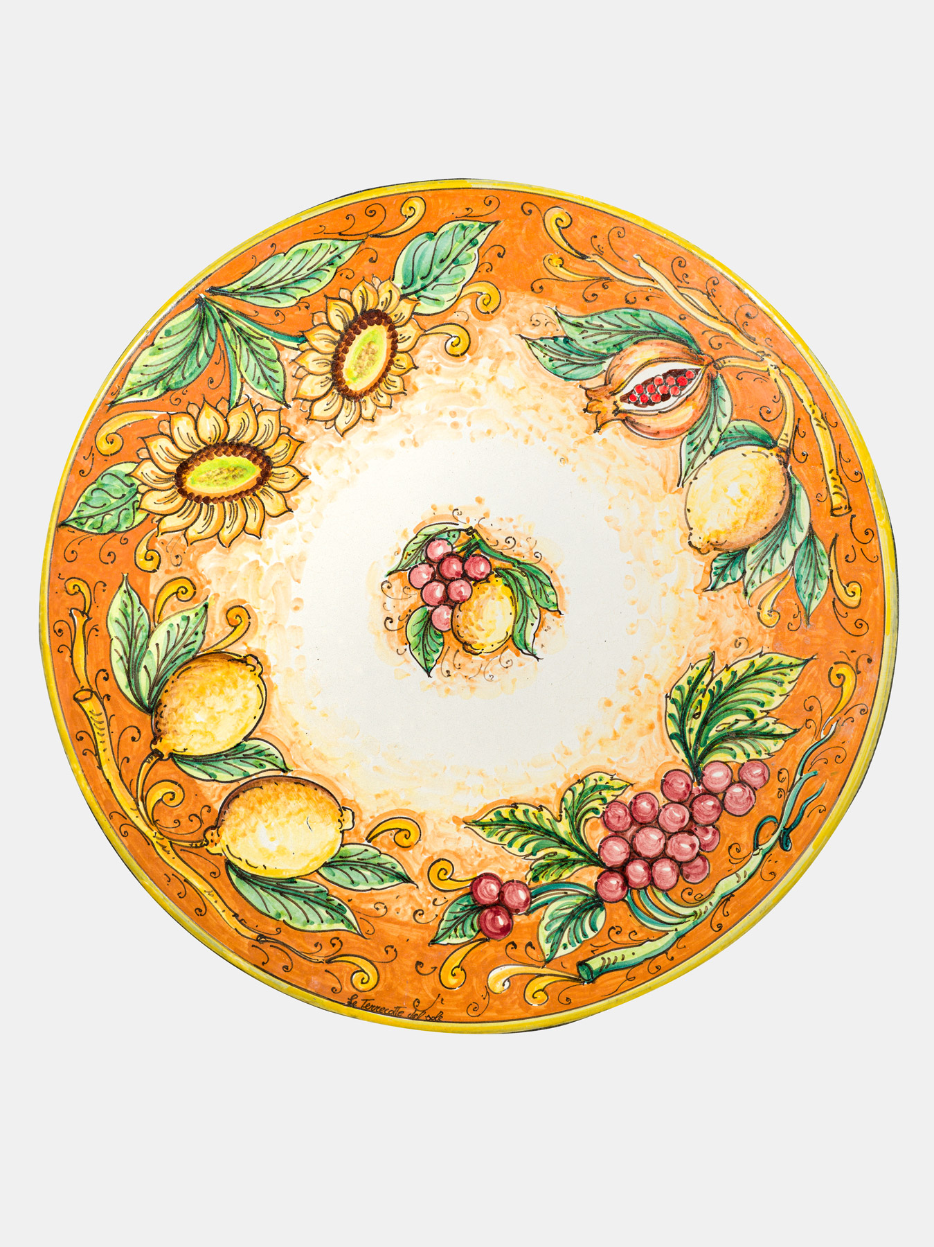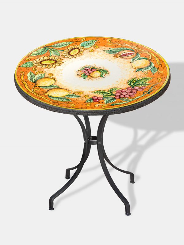 Die Tischplatte ist ein Meisterstück der Handwerkskunst und präsentiert eine lebendige Verzierung von Zitronen, Trauben, Granatäpfeln und Sonnenblumen. Diese fröhlichen Motive sind in lebendigen Farben gestaltet, wobei das leuchtende Gelb der Zitronen, das kräftige Violett der Trauben, das sinnliche Rot der Granatäpfel und das strahlende Gelb der Sonnenblumen eine lebendige und ansprechende Kombination bilden.