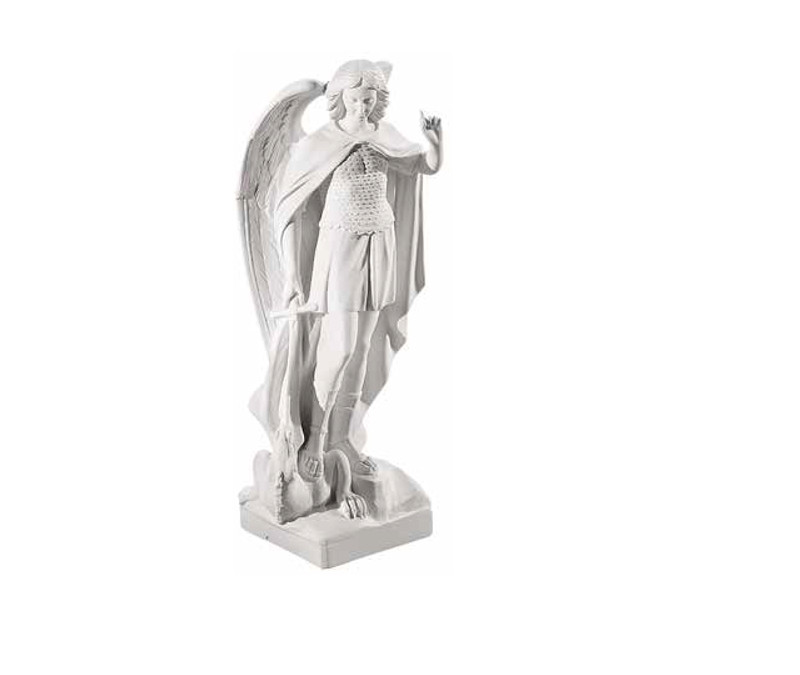 Der Erzengel Michael wird als kraftvoller und majestätischer Engel dargestellt, der in einer kriegerischen Haltung erscheint, um das Böse zu bekämpfen und Gerechtigkeit zu bringen. Seine Figur könnte von muskulöser Statur sein, um seine Stärke und Entschlossenheit zu betonen. Seine Flügel sind ausgebreitet sein, um seine göttliche Natur und seine Fähigkeit zu fliegen zu symbolisieren. Im Allgemeinen wird der Erzengel Michael mit einem Schwert oder einem Speer bewaffnet dargestellt, das er hoch erhoben oder in einer kämpferischen Pose trägt. Diese Waffe repräsentiert seine Rolle als Anführer der himmlischen Streitkräfte im Kampf gegen das Böse. Sein Gesichtsausdruck ist ernst und entschlossen. Er strahlt eine Aura von Autorität und Göttlichkeit aus. Die Details der Skulptur sind sehr fein ausgearbeitet, um die Schönheit und die göttliche Natur des Erzengels Michael zu betonen. Seine Rüstung ist mit feinen Details verziert sein, um seine himmlische Herkunft und seine Stellung als Engel des Lichts zu unterstreichen.Insgesamt verkörpert die Statue des Erzengels Michael aus Marmor Stärke, Schönheit und göttliche Macht und inspiriert Bewunderung und Ehrfurcht für seine Rolle im spirituellen Kampf zwischen Gut und Böse.