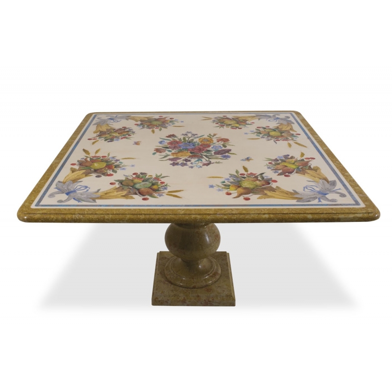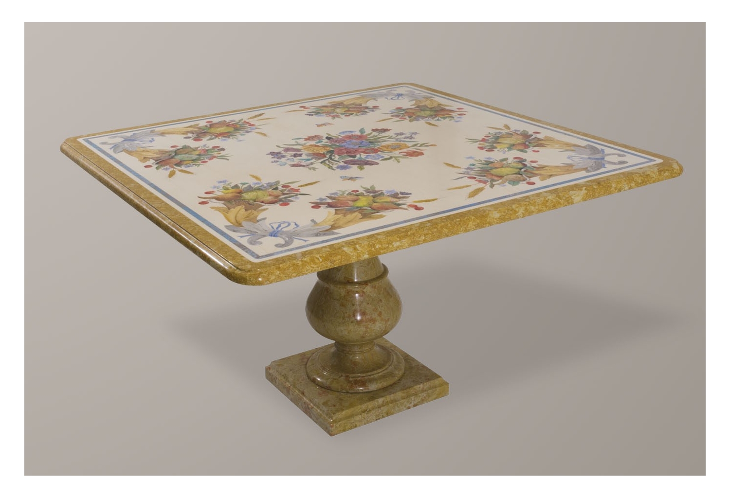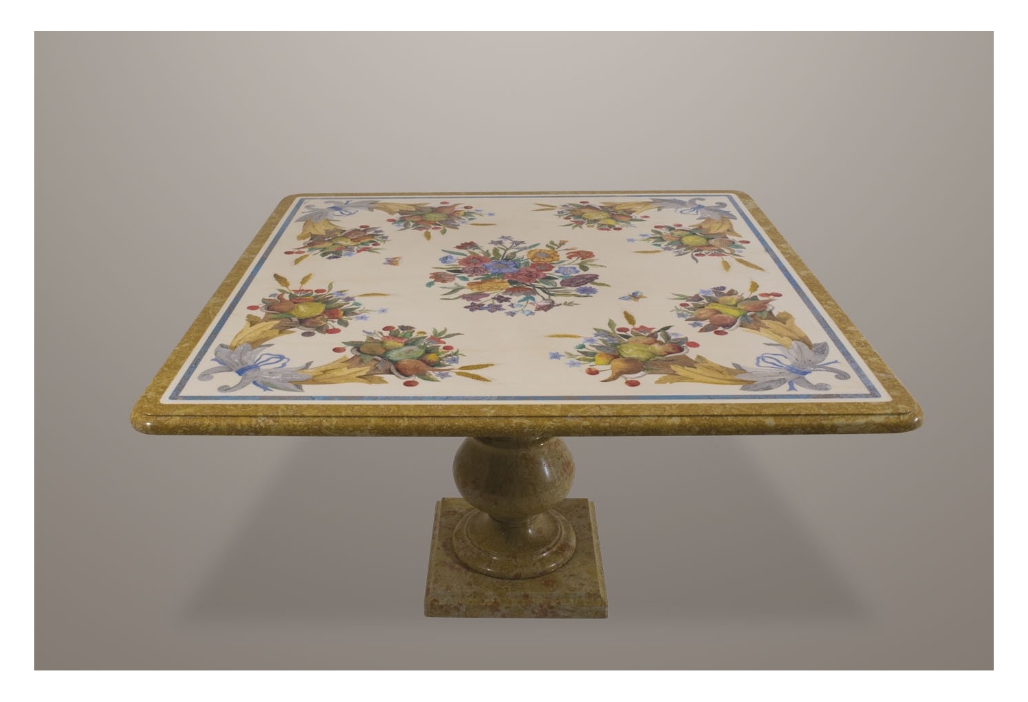 Esstisch mit weiß/gelber Marmorplatte und Marmorfuß. Die Platte ist mit Scagliola Intarsien verziert. Dargestellt sind Füllhörner, die kunstvoll mit Früchten und Blumen miteinander verbunden sind. Die ist ein Dekor aus dem XVIII. Jahrhundert. Scagliola ist die antike Kunst, architektonische Elemente aus Stuck herzustellen, die wie Marmor aussehen. Diese Technik erlangte im 18. Jahrhundert in Florenz und Venedig einen hohen Bekanntheitsgrad. Hergestellt wird ein Marmorimitat, was mit farblich strahlenden Intarsien gefüllt wird. Somit entsteht eine schimmernde von innen heraus scheinende Wirkung, die langfristig strahlend bleibt.