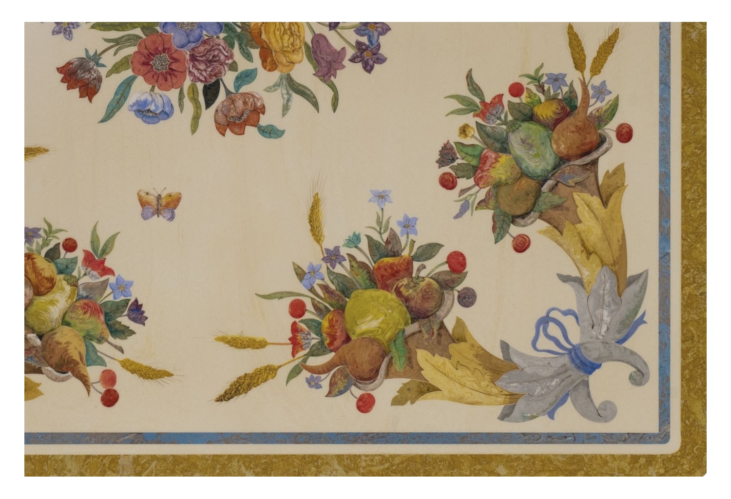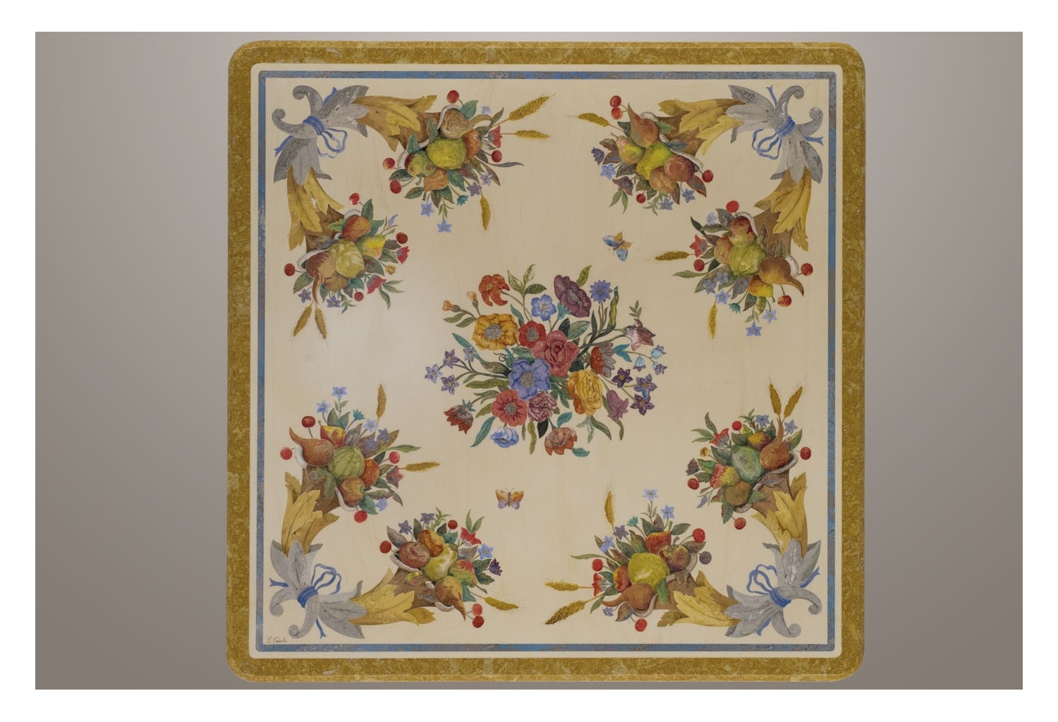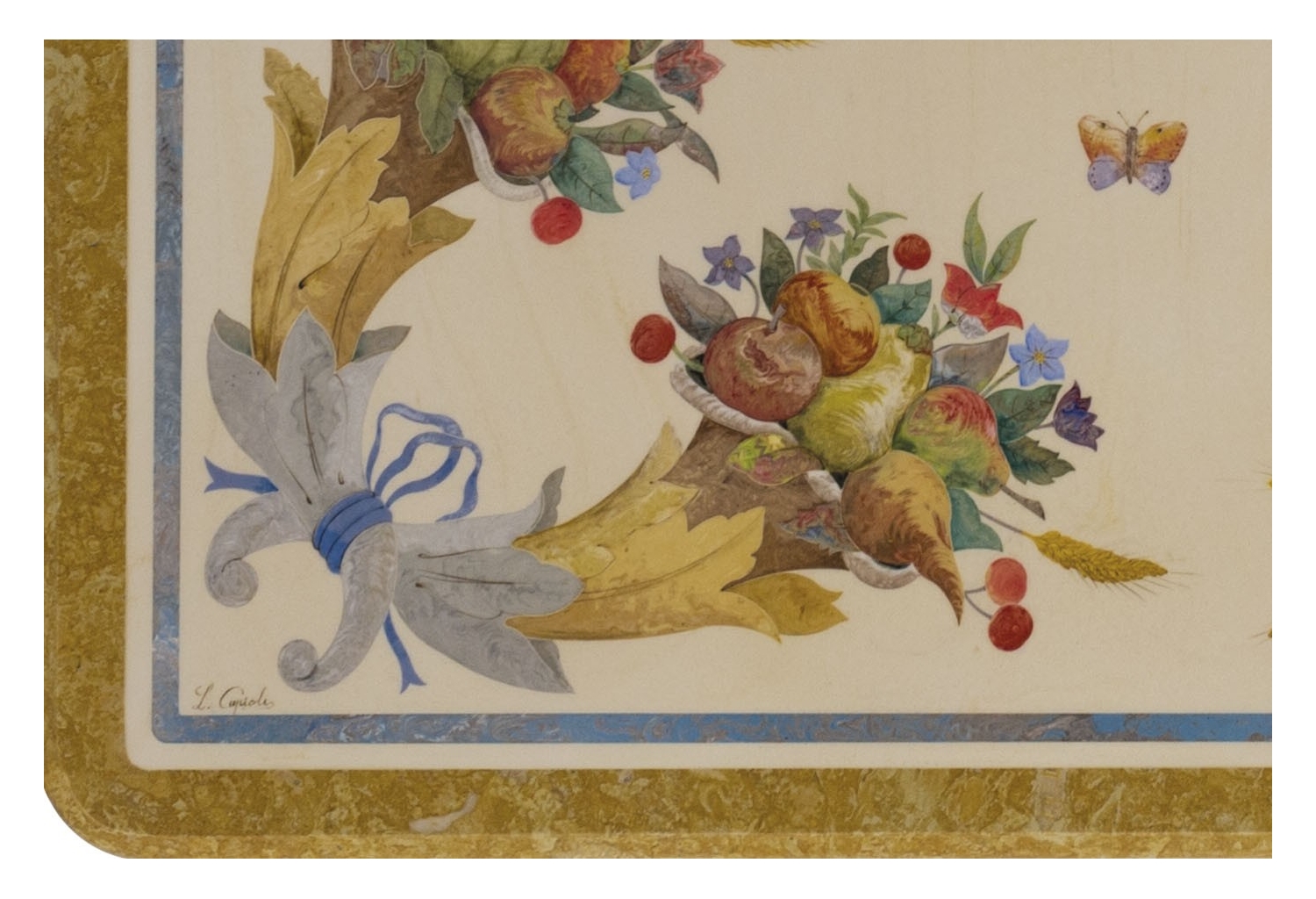 Esstisch mit weiß/gelber Marmorplatte und Marmorfuß. Die Platte ist mit Scagliola Intarsien verziert. Dargestellt sind Füllhörner, die kunstvoll mit Früchten und Blumen miteinander verbunden sind. Die ist ein Dekor aus dem XVIII. Jahrhundert. Scagliola ist die antike Kunst, architektonische Elemente aus Stuck herzustellen, die wie Marmor aussehen. Diese Technik erlangte im 18. Jahrhundert in Florenz und Venedig einen hohen Bekanntheitsgrad. Hergestellt wird ein Marmorimitat, was mit farblich strahlenden Intarsien gefüllt wird. Somit entsteht eine schimmernde von innen heraus scheinende Wirkung, die langfristig strahlend bleibt.