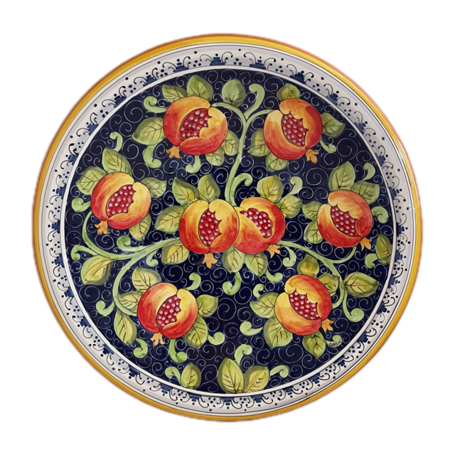 Der handbemalte Keramikteller aus der Toskana präsentiert eine bezaubernde Darstellung von Granatäpfeln und ihren grünen Blättern auf einem tiefblauen Hintergrund. Die Granatäpfel sind meisterhaft gemalt, ihre rubinroten Kerne und die strukturierte Schale werden mit beeindruckender Detailgenauigkeit wiedergegeben. Die grünen Blätter umrahmen die Früchte, ihre Formen und Adern sind kunstvoll gestaltet und verleihen der Szene eine natürliche Lebendigkeit.