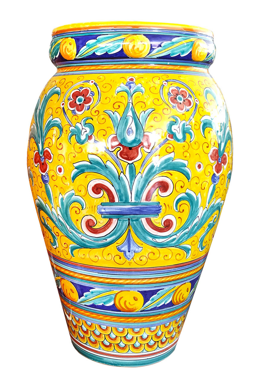 Der handbemalte Schirmständer aus Deruta, Italien, ist ein exquisites Beispiel traditioneller italienischer Keramikkunst. Er besticht durch seinen warmen, gelben Untergrund, der als leuchtende Basis für das kunstvolle Dekor dient. Das geschwungene Deruta-Muster entfaltet sich in strahlenden Farben – mit filigranen floralen und ornamental-verspielten Elementen, die meisterhaft von Hand aufgetragen wurden.