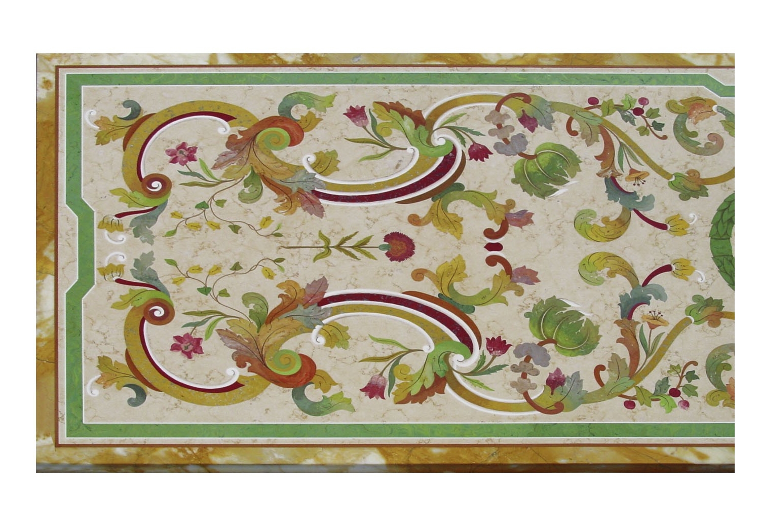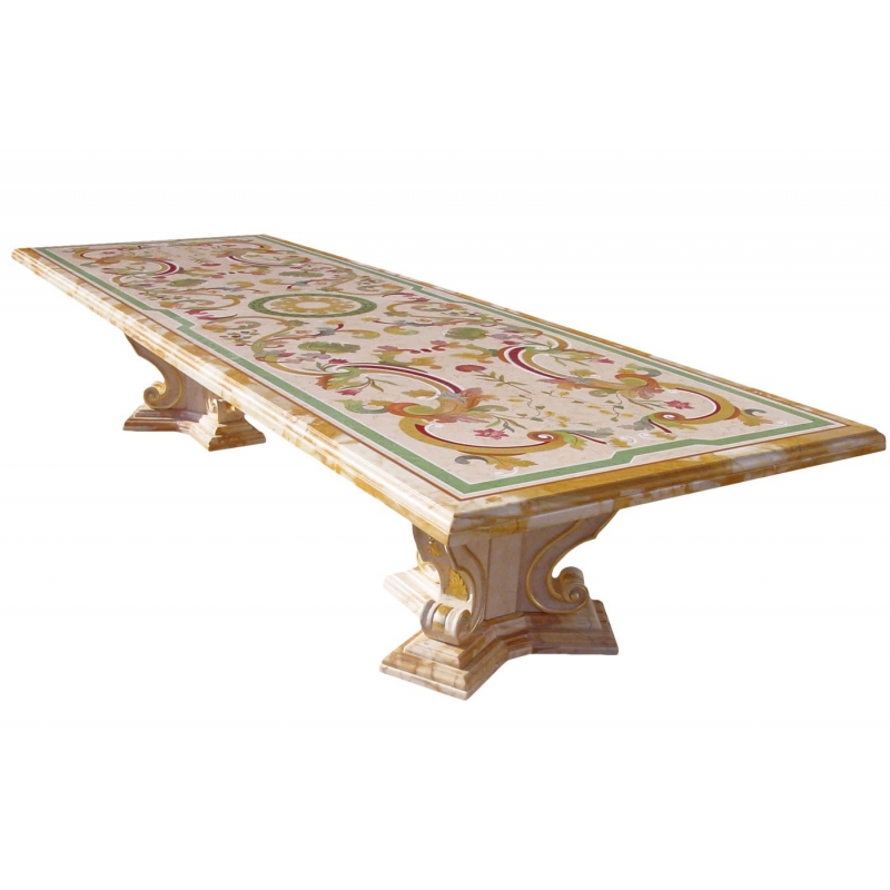 Gallio ist ein großer Esstisch oder Konferenztisch verziert mit Scagliola Intarsien. Die Platte besteht aus 6 Marmorplatten. Eingearbeitet ist ein edles Muster mit Blumen, Obstkörben und Wappen, eine Vorlage aus dem XVIII. Jahrhundert. Die Tischfüße bestehen aus Holz, verziert mit Blattgold. Scagliola ist die antike Kunst, architektonische Elemente aus Stuck herzustellen, die wie Marmor aussehen. Diese Technik erlangte im 18. Jahrhundert in Florenz und Venedig einen hohen Bekanntheitsgrad. Hergestellt wird eine dekorierte Marmorplatte, die mit farblich strahlenden Intarsien gefüllt wird. Somit entsteht eine schimmernde von innen heraus scheinende Wirkung, die langfristig strahlend bleibt.