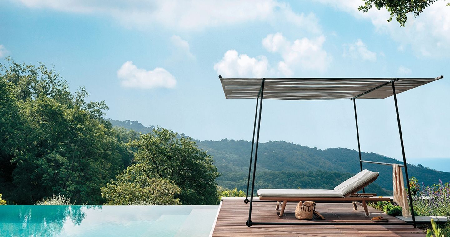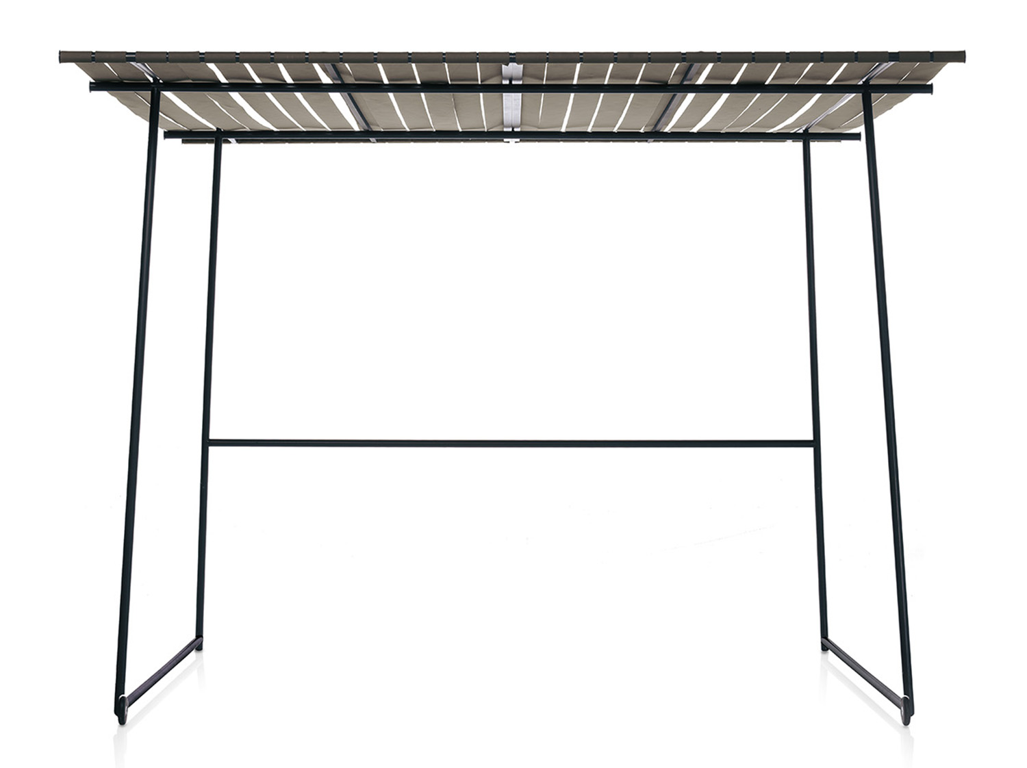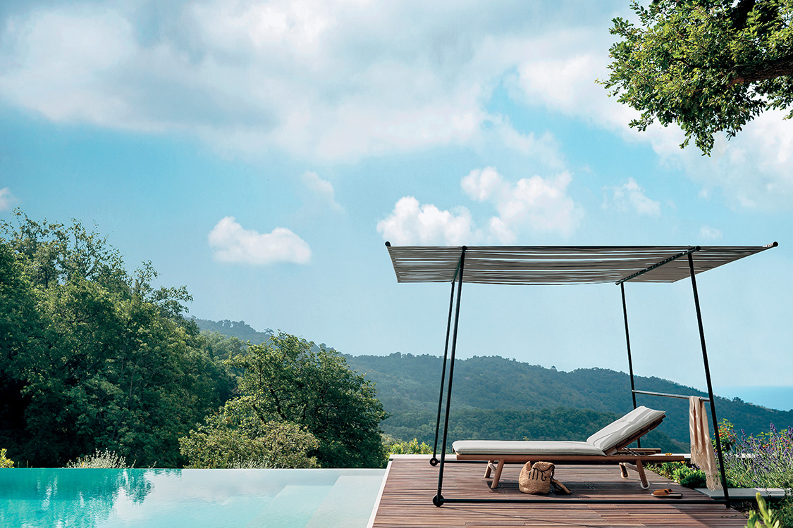 Ombrina ist ein freitragender Gartenpavillon mit mediterranem Flair. Ein Sonnenschutz mit einer Struktur aus pulverlackiertem Edelstahlrohr in den Farben Smoke oder Milk, dessen Überdachung aus 90 mm breiten Polyestergurten, in der Farbe Grau hergestellt ist, die die Sonne durchfiltern lassen, und eine angenehme Ruhezone bilden. Der Gartenpavillon ist mit Rädern ausgestattet, um ihn nach Bedarf zu verschieben. Ombrina kann auch mit Vorhängen versehen werden, wodurch sowohl eine Abgrenzung als auch eine luftige Eleganz erzeugt werden kann.