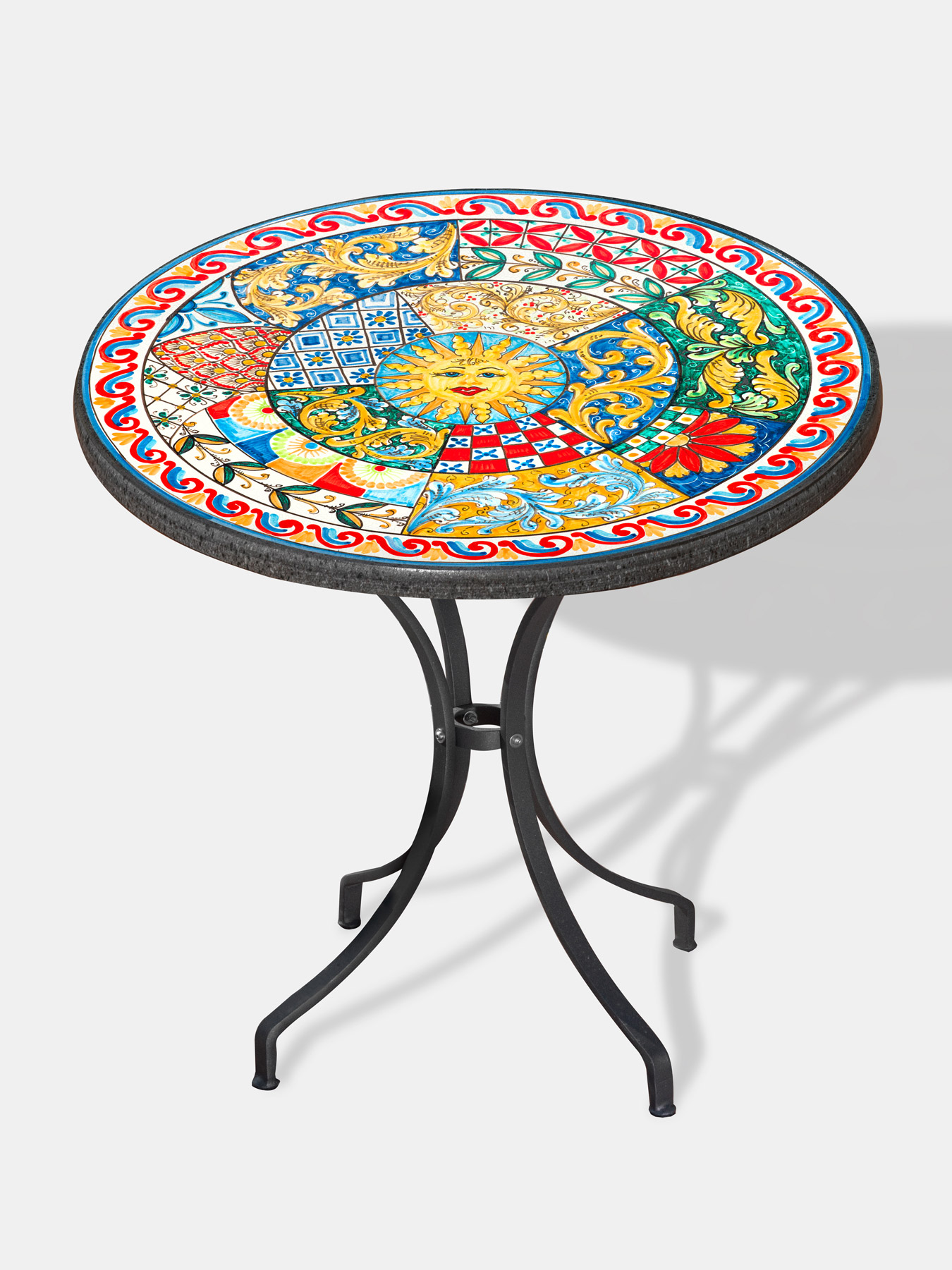 Die Lavastein-Tischplatte begeistert mit einer außergewöhnlich farbenfrohen Gestaltung. Im Zentrum strahlt eine gelbe Sonne mit fröhlichem Gesicht, deren kräftige Strahlen sich über die gesamte Oberfläche ausbreiten. Umgeben wird das Sonnenmotiv von geometrischen und floralen Mustern, die in intensiven Farben wie Rot, Blau, Grün und Gelb gehalten sind. Kreise, Dreiecke und Quadrate sorgen für Dynamik und Lebendigkeit, während Blumen, Blätter und feine Ranken dem Design eine organische, natürliche Note verleihen. Diese Kombination erinnert an die üppige Vegetation, die bunten Blumenfelder und die Lebensfreude Siziliens.