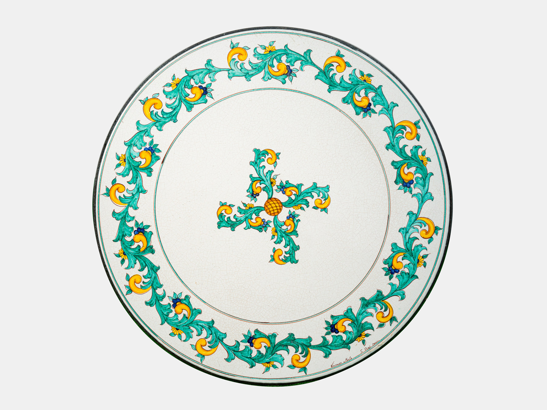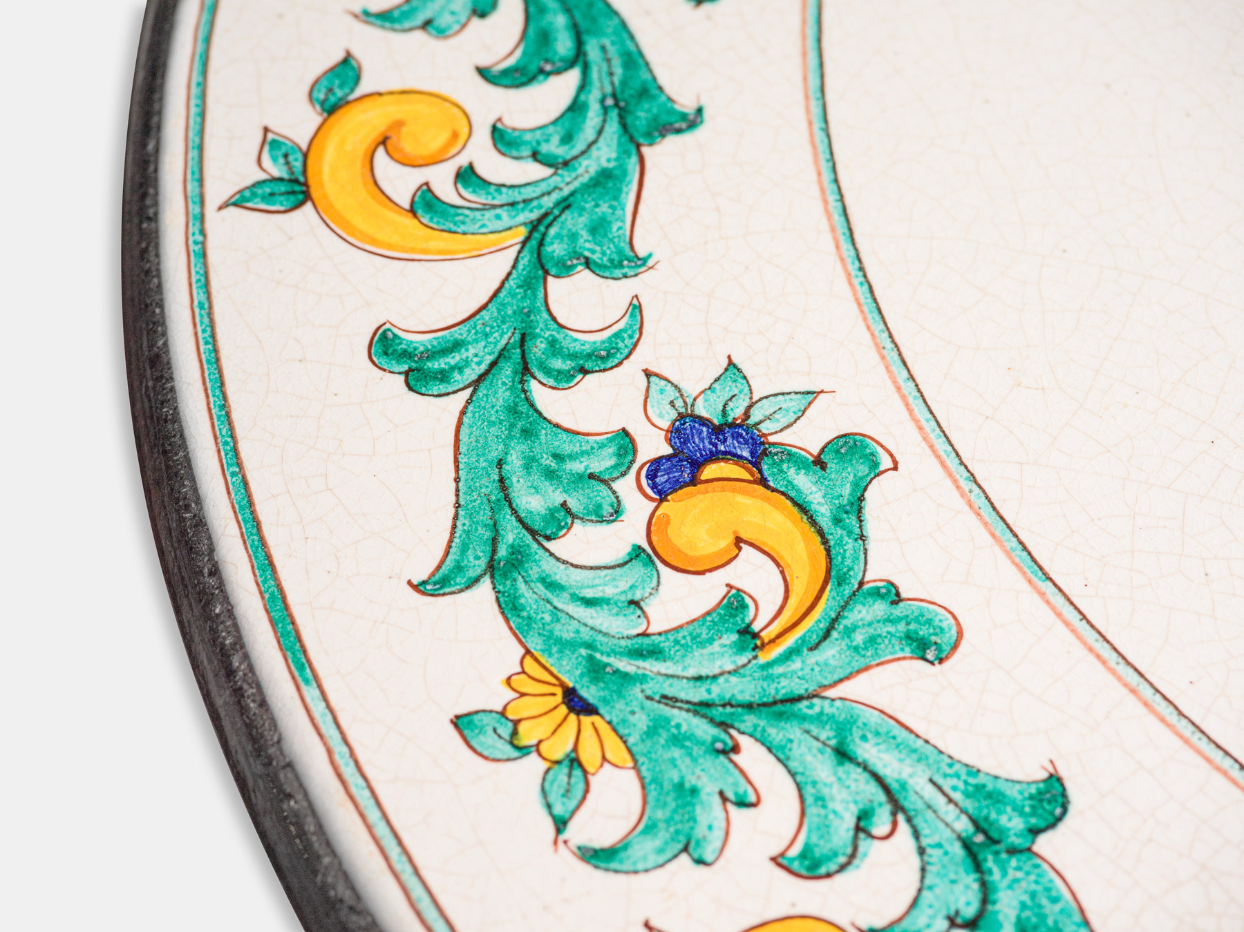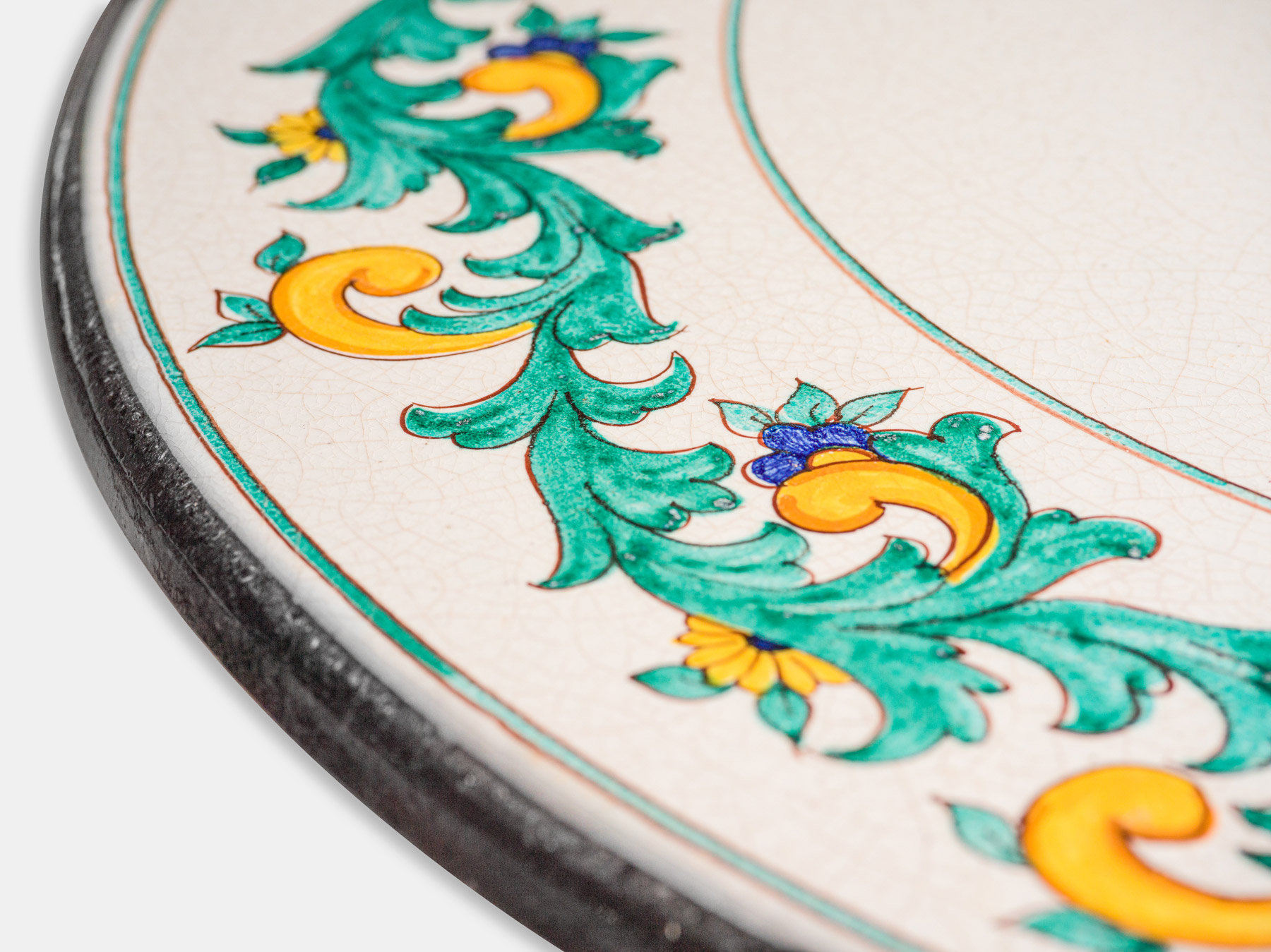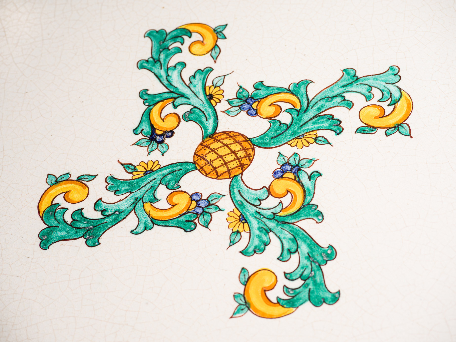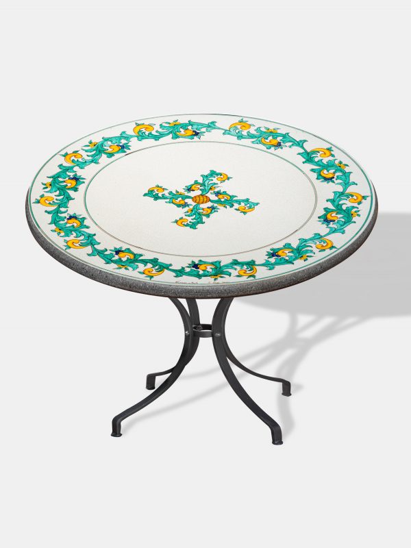 Dieser runde Gartentisch aus Lavastein ist ein wahres Kunstwerk der Gartenmöbel. Die Tischplatte ist in strahlendem Weiß gehalten und mit kunstvollen türkisfarbenen Blättern bemalt, die den Tisch in einem floralen Muster umranden. Die Blätter sind elegant und geschmackvoll angeordnet und verleihen der Tischplatte eine lebendige und frische Ausstrahlung. Das Design der türkisfarbenen Blätter, die den Tisch umrahmen und in der Mitte zusätzlich dekoriert sind, schafft eine harmonische Verbindung zwischen der natürlichen Robustheit des Lavasteins und der künstlerischen Eleganz der Malerei. Die Farbkombination von Weiß und Türkis verleiht dem Tisch eine luftige Leichtigkeit und passt perfekt in einen Garten oder eine Terrasse, indem sie eine ruhige und erfrischende Atmosphäre schafft. Dieser Tisch ist nicht nur ein funktionales Möbelstück im Garten, sondern auch ein ästhetisches Highlight, das Aufmerksamkeit erregt und den Außenbereich mit seiner Schönheit bereichert.