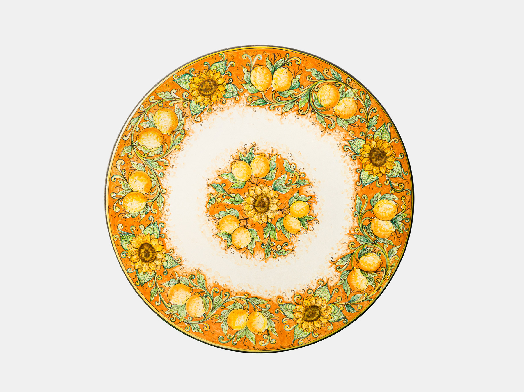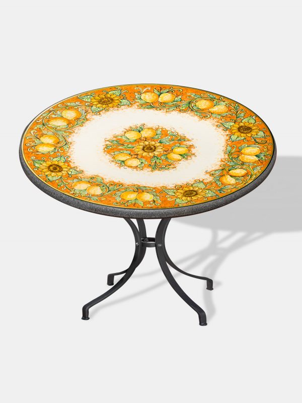 Ein bunter, großer Gartentisch aus Sizilien, der mit Zitronen und Sonnenblumen bemalt ist und aus Lavastein gefertigt wurde, ist ein strahlendes Kunstwerk, das die lebhafte und sonnige Natur der sizilianischen Landschaft einfängt. Der Lavastein als Material verleiht diesem Tisch eine robuste Struktur, die für ihre Langlebigkeit und natürliche Schönheit geschätzt wird. Die bemalte Oberfläche des Tisches zeigt eine malerische Szenerie von Zitronen und Sonnenblumen, zwei ikonische Symbole der mediterranen Landschaft Siziliens. Die Zitronen sind in kräftigen Gelbtönen mit detaillierten Texturen und Schattierungen dargestellt, um ihre Frische und Lebendigkeit widerzuspiegeln. Die Sonnenblumen blühen in lebhaften Gold- und Orangetönen, wobei ihre strahlenden Blütenblätter und charakteristischen Gesichter die Oberfläche des Tisches beleben. Die Kunstfertigkeit, mit der diese Motive auf den Lavastein gemalt oder graviert sind, verleiht dem Tisch eine lebendige und künstlerische Atmosphäre. Die lebhaften Farben und die detaillierten Darstellungen der Zitronen und Sonnenblumen schaffen eine Szenerie, die an die fruchtbaren und sonnendurchfluteten Landschaften Siziliens erinnert. Die Größe des Tisches ermöglicht es, diese malerischen Motive großzügig darzustellen und schafft damit eine auffällige Präsenz im Garten. Dieser Tisch wird nicht nur zu einem funktionalen Element im Außenbereich, sondern auch zu einem lebendigen Kunstwerk, das die Schönheit der Natur und die künstlerische Ausdrucksform auf faszinierende Weise vereint.